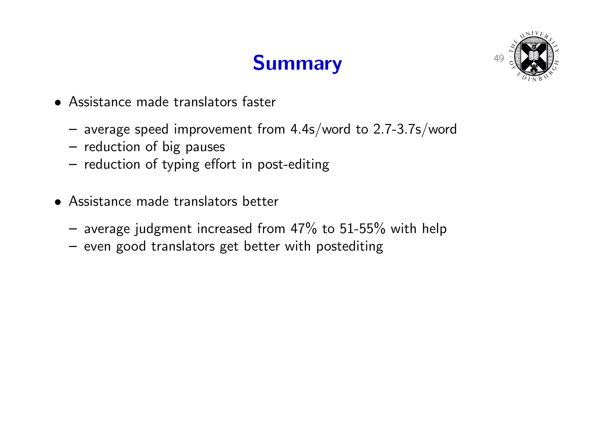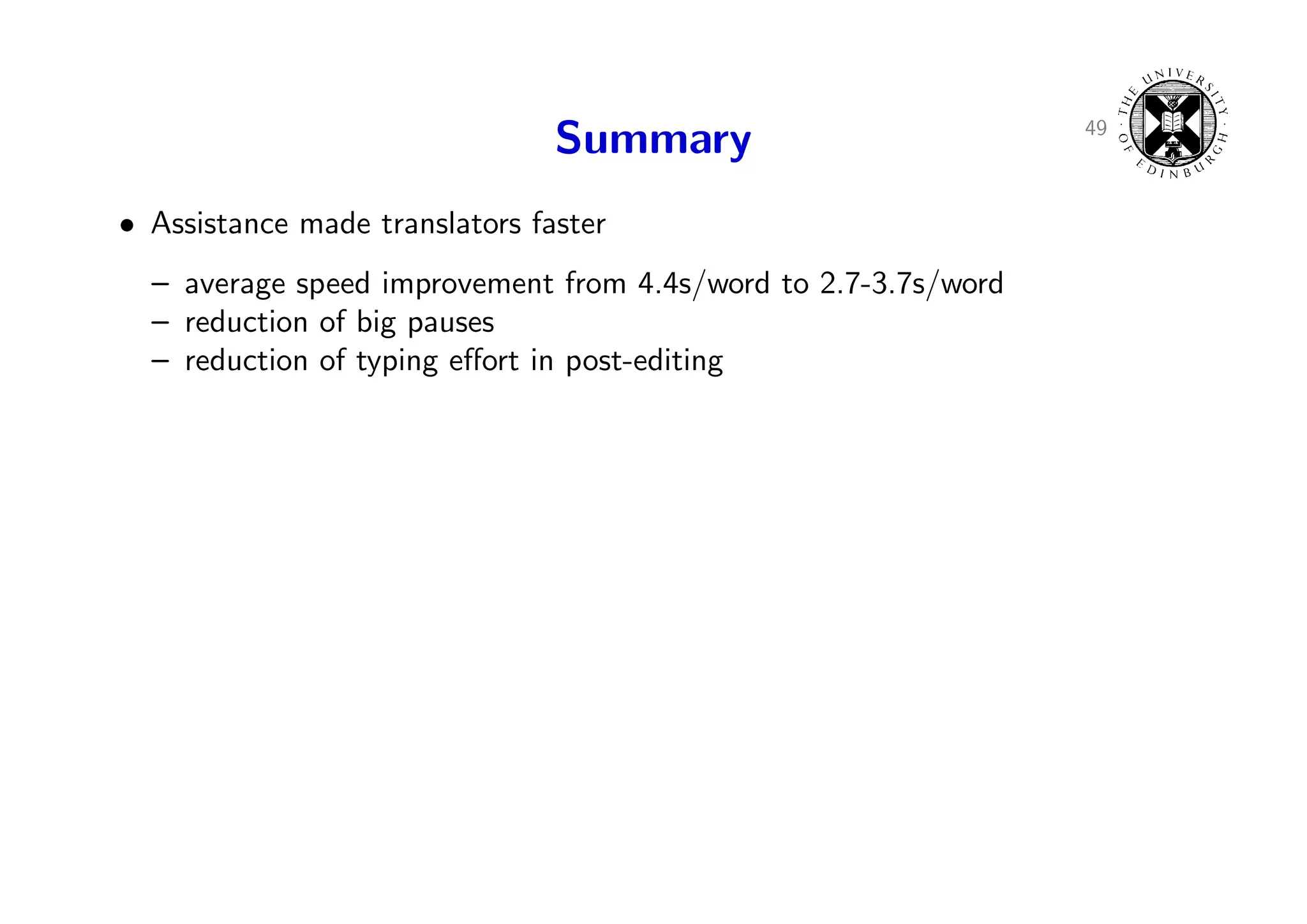 72. 72. 49 Summary • Assistance made translators faster – average speed improvement from 4.4s/word to 2.7-3.7s/word – reduction of big pauses – reduction of typing effort in post-editing • Assistance made translators better – average judgment increased from 47% to 51-55% with help – even good translators get better with postediting