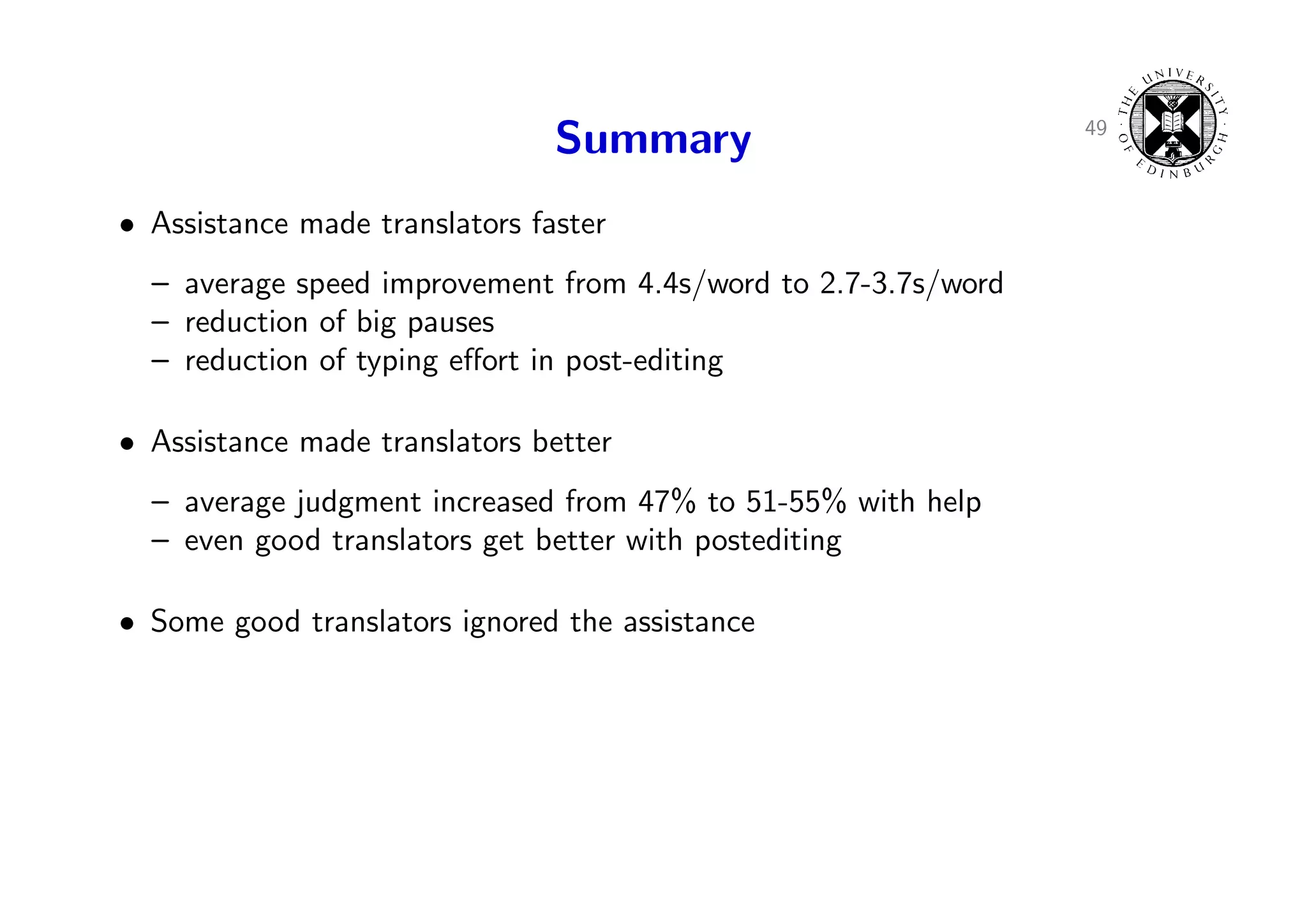 73. 73. 49 Summary • Assistance made translators faster – average speed improvement from 4.4s/word to 2.7-3.7s/word – reduction of big pauses – reduction of typing effort in post-editing • Assistance made translators better – average judgment increased from 47% to 51-55% with help – even good translators get better with postediting • Some good translators ignored the assistance