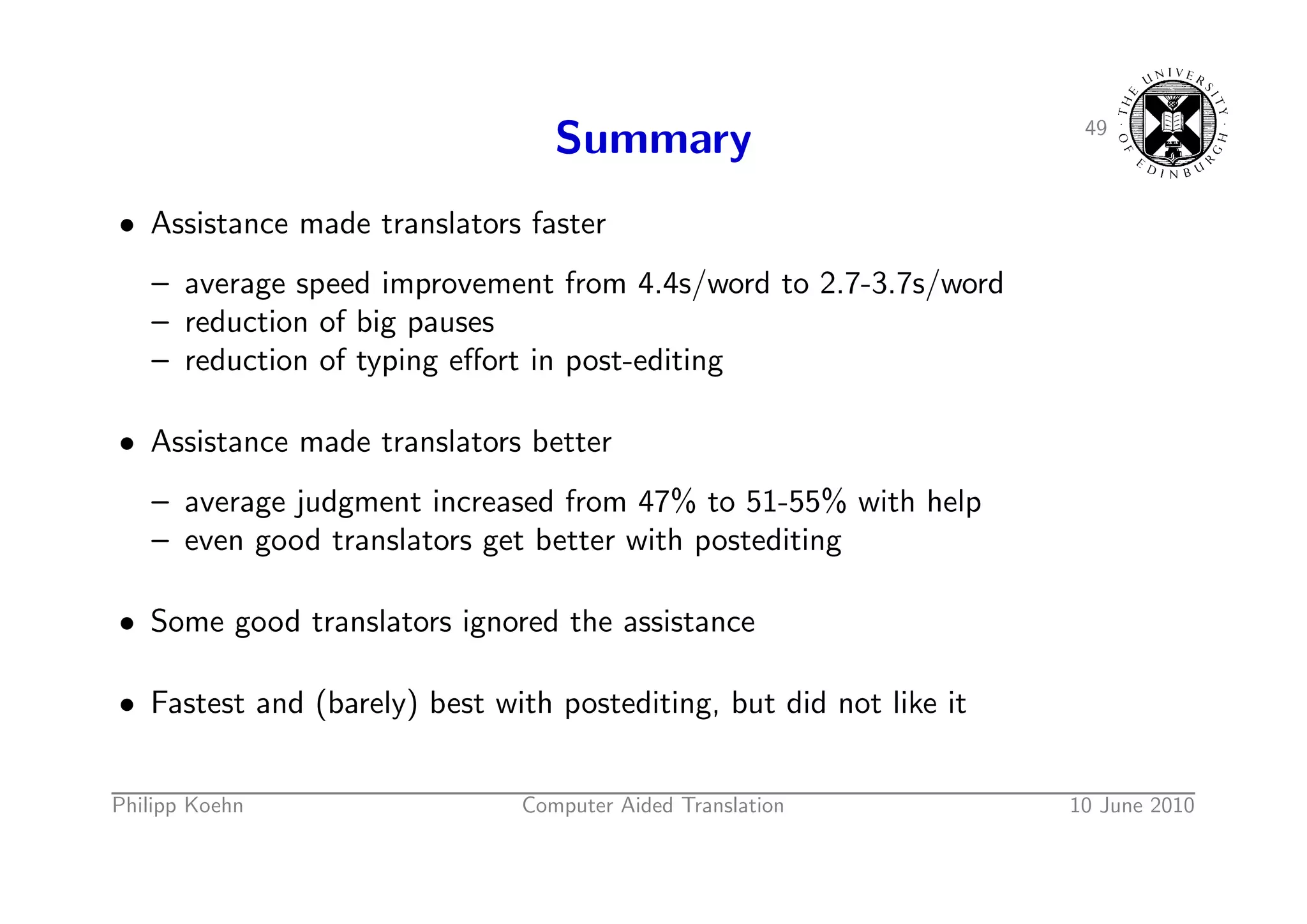 74. 74. 49 Summary • Assistance made translators faster – average speed improvement from 4.4s/word to 2.7-3.7s/word – reduction of big pauses – reduction of typing effort in post-editing • Assistance made translators better – average judgment increased from 47% to 51-55% with help – even good translators get better with postediting • Some good translators ignored the assistance • Fastest and (barely) best with postediting, but did not like it Philipp Koehn Computer Aided Translation 10 June 2010