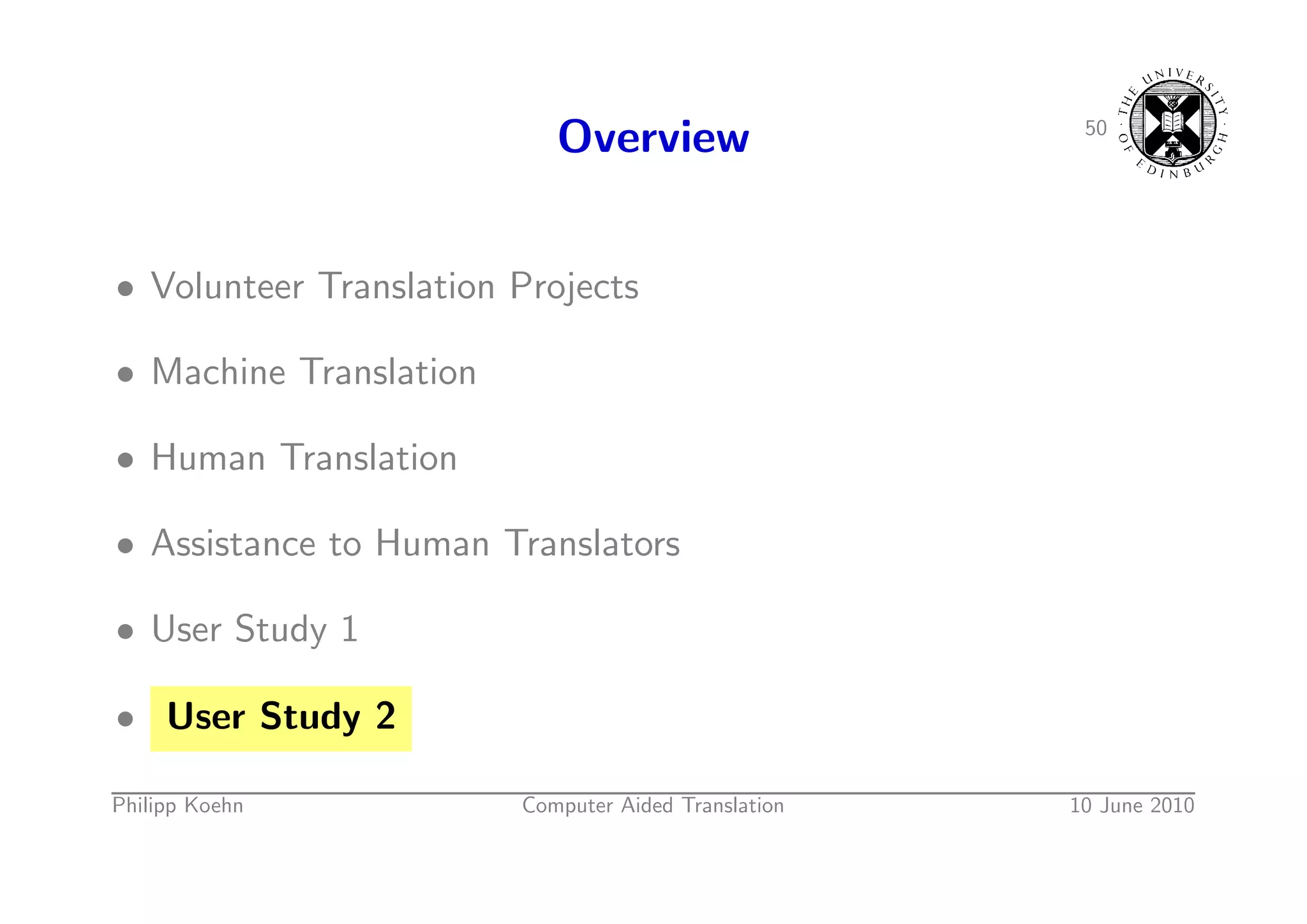 75. 75. 50 Overview • Volunteer Translation Projects • Machine Translation • Human Translation • Assistance to Human Translators • User Study 1 • User Study 2 Philipp Koehn Computer Aided Translation 10 June 2010