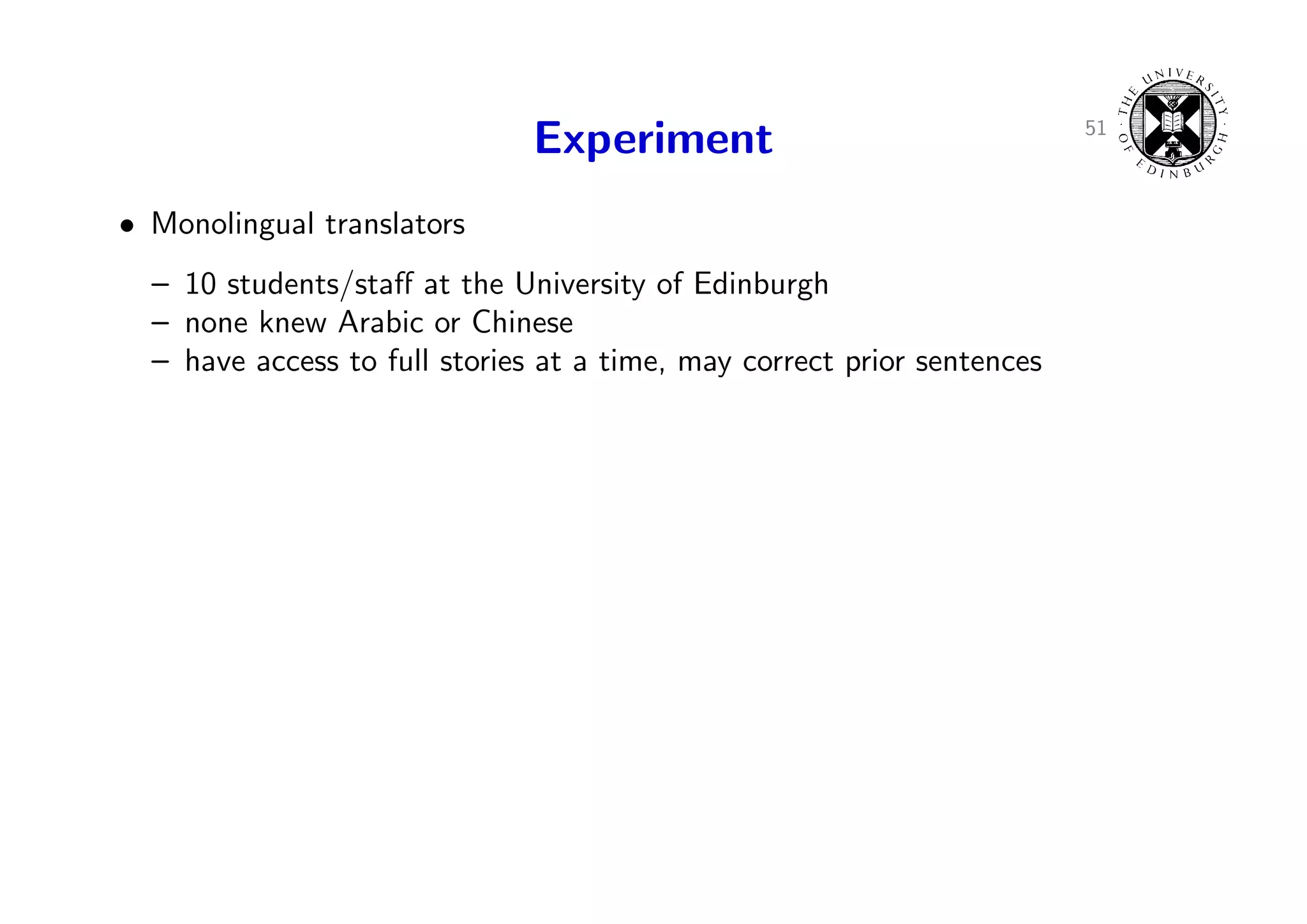 76. 76. 51 Experiment • Monolingual translators – 10 students/staff at the University of Edinburgh – none knew Arabic or Chinese – have access to full stories at a time, may correct prior sentences