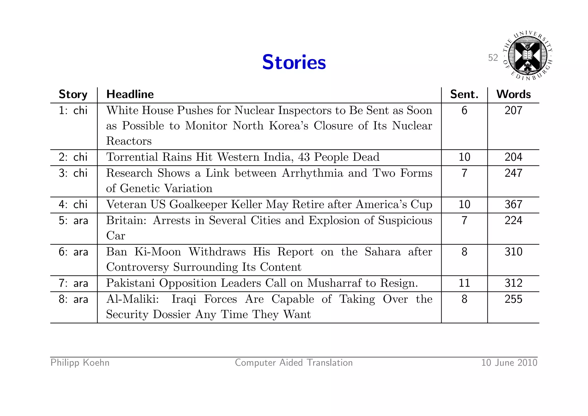 78. 78. 52 Stories Story Headline Sent. Words 1: chi White House Pushes for Nuclear Inspectors to Be Sent as Soon 6 207 as Possible to Monitor North Korea’s Closure of Its Nuclear Reactors 2: chi Torrential Rains Hit Western India, 43 People Dead 10 204 3: chi Research Shows a Link between Arrhythmia and Two Forms 7 247 of Genetic Variation 4: chi Veteran US Goalkeeper Keller May Retire after America’s Cup 10 367 5: ara Britain: Arrests in Several Cities and Explosion of Suspicious 7 224 Car 6: ara Ban Ki-Moon Withdraws His Report on the Sahara after 8 310 Controversy Surrounding Its Content 7: ara Pakistani Opposition Leaders Call on Musharraf to Resign. 11 312 8: ara Al-Maliki: Iraqi Forces Are Capable of Taking Over the 8 255 Security Dossier Any Time They Want Philipp Koehn Computer Aided Translation 10 June 2010