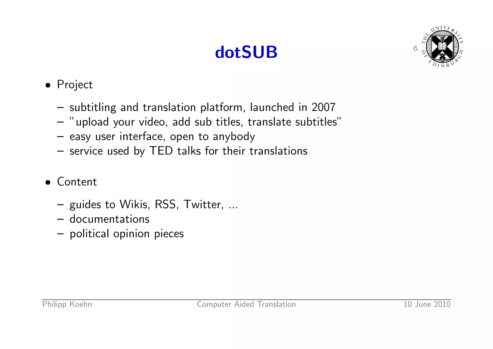 8. 8. 6 dotSUB • Project – subtitling and translation platform, launched in 2007 – ”upload your video, add sub titles, translate subtitles” – easy user interface, open to anybody – service used by TED talks for their translations • Content – guides to Wikis, RSS, Twitter, ... – documentations – political opinion pieces Philipp Koehn Computer Aided Translation 10 June 2010