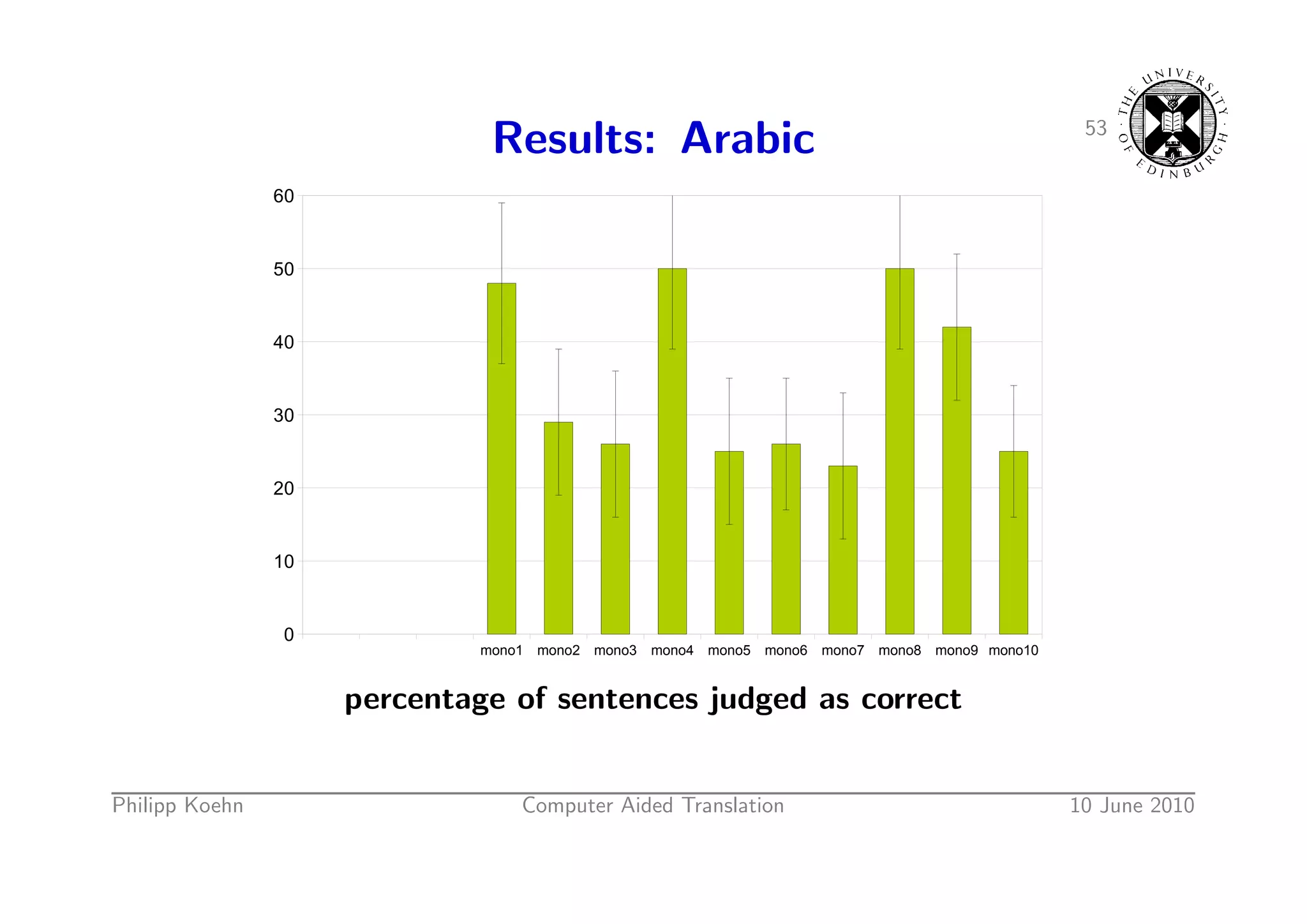 79. 79. 53 Results: Arabic 60 50 40 30 20 10 0 mono1 mono2 mono3 mono4 mono5 mono6 mono7 mono8 mono9 mono10 percentage of sentences judged as correct Philipp Koehn Computer Aided Translation 10 June 2010