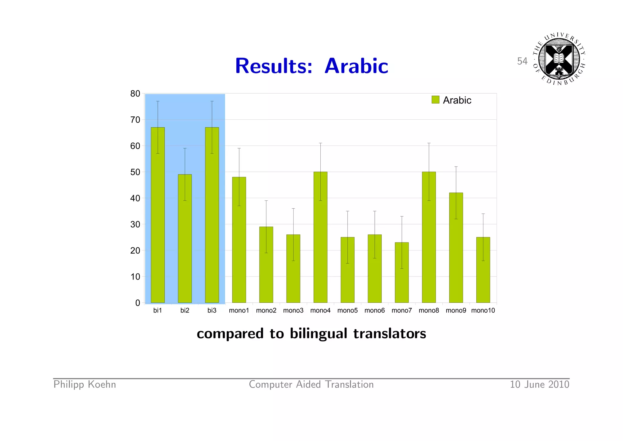 80. 80. 54 Results: Arabic 80 Arabic 70 60 50 40 30 20 10 0 bi1 bi2 bi3 mono1 mono2 mono3 mono4 mono5 mono6 mono7 mono8 mono9 mono10 compared to bilingual translators Philipp Koehn Computer Aided Translation 10 June 2010