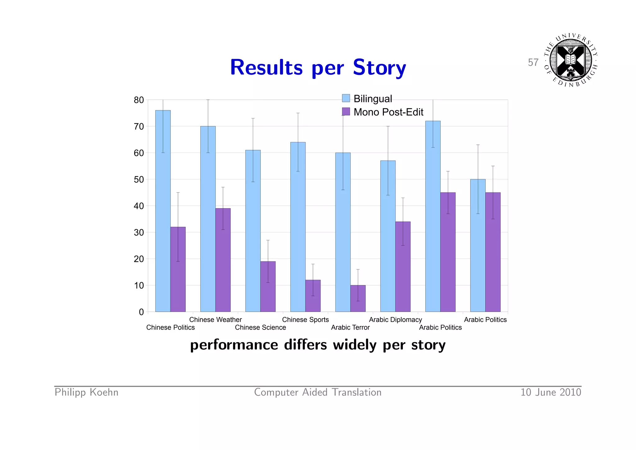 83. 83. 57 Results per Story 80 Bilingual Mono Post-Edit 70 60 50 40 30 20 10 0 Chinese Weather Chinese Sports Arabic Diplomacy Arabic Politics Chinese Politics Chinese Science Arabic Terror Arabic Politics performance differs widely per story Philipp Koehn Computer Aided Translation 10 June 2010