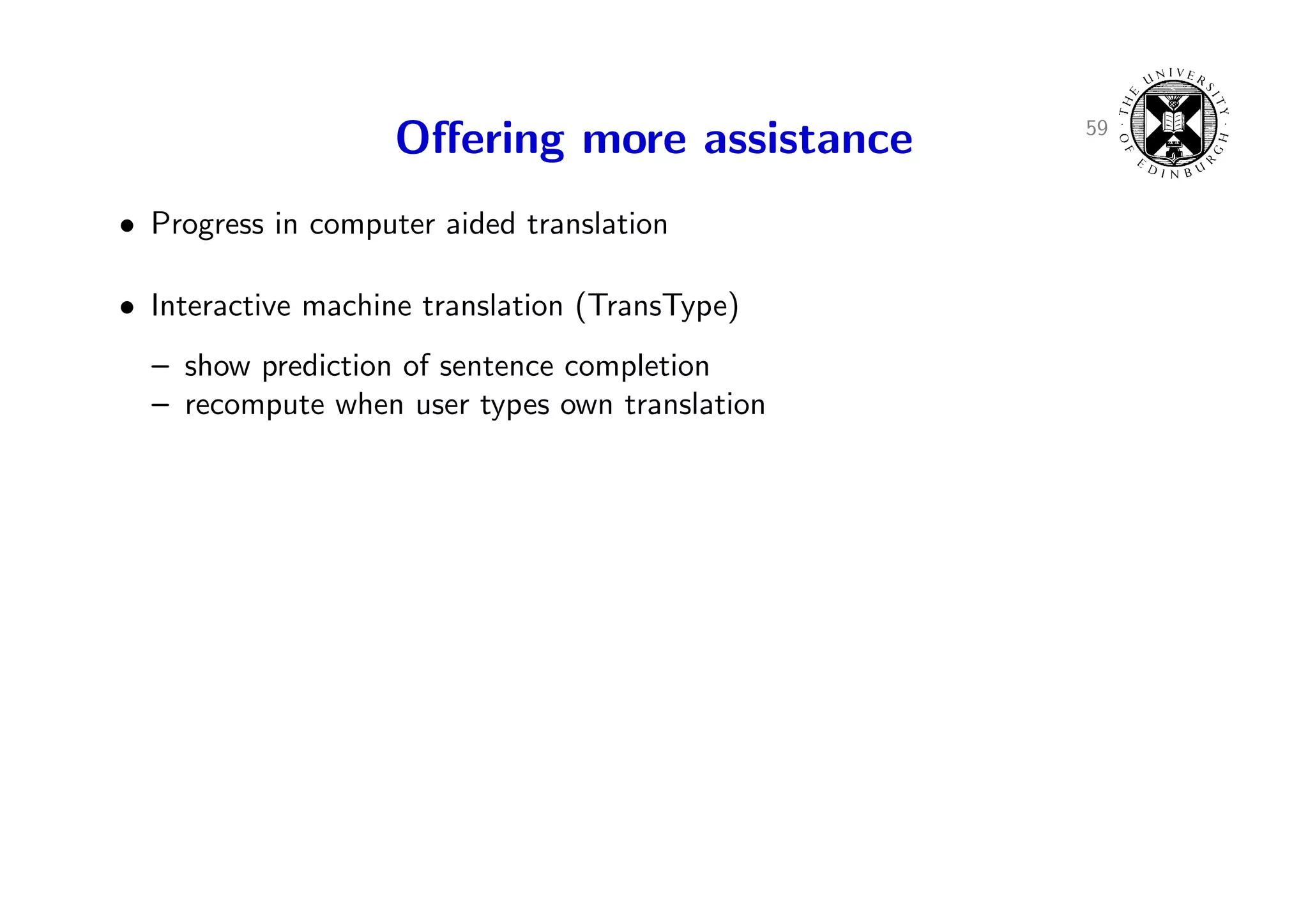 86. 86. 59 Offering more assistance • Progress in computer aided translation • Interactive machine translation (TransType) – show prediction of sentence completion – recompute when user types own translation