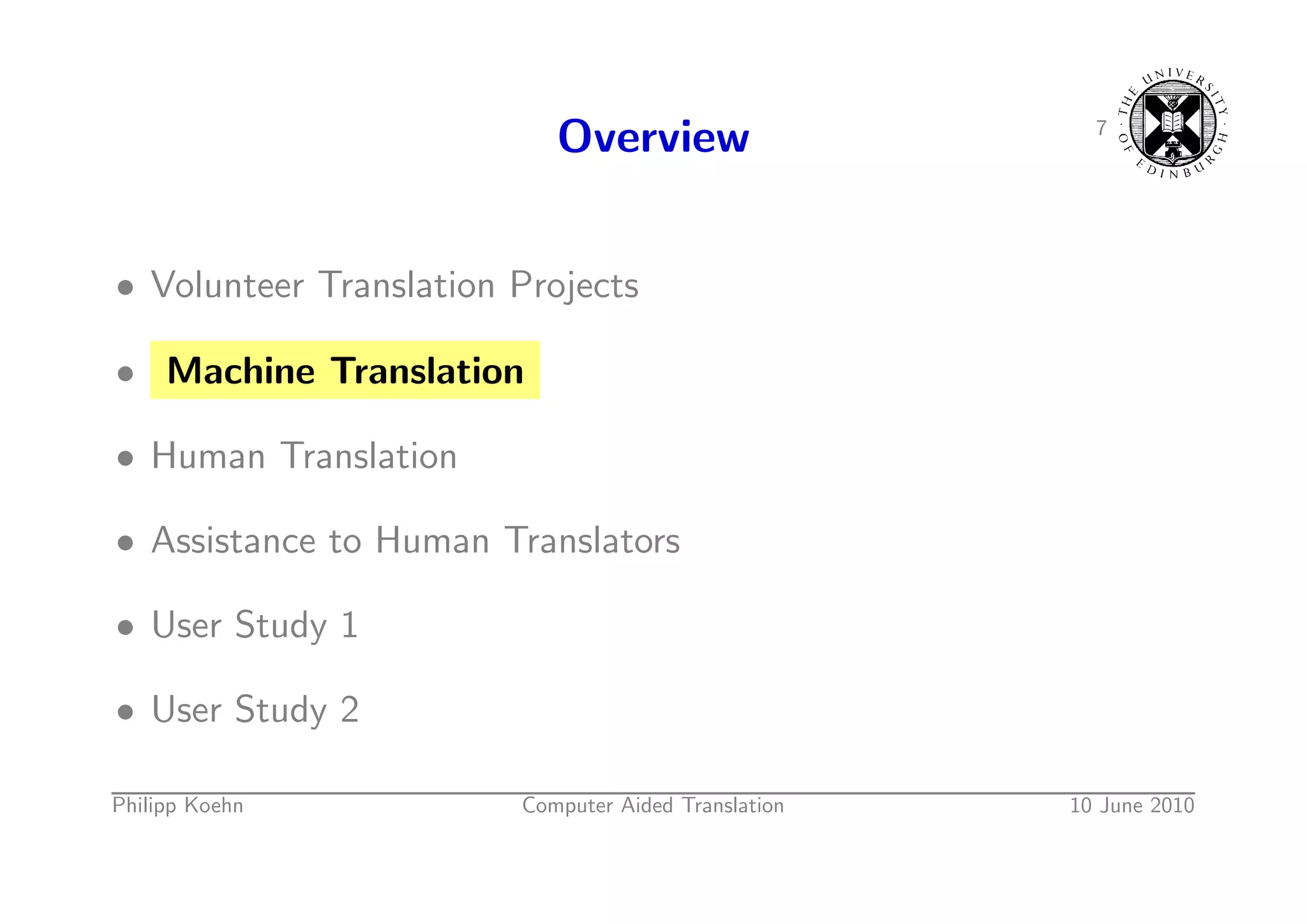 9. 9. 7 Overview • Volunteer Translation Projects • Machine Translation • Human Translation • Assistance to Human Translators • User Study 1 • User Study 2 Philipp Koehn Computer Aided Translation 10 June 2010