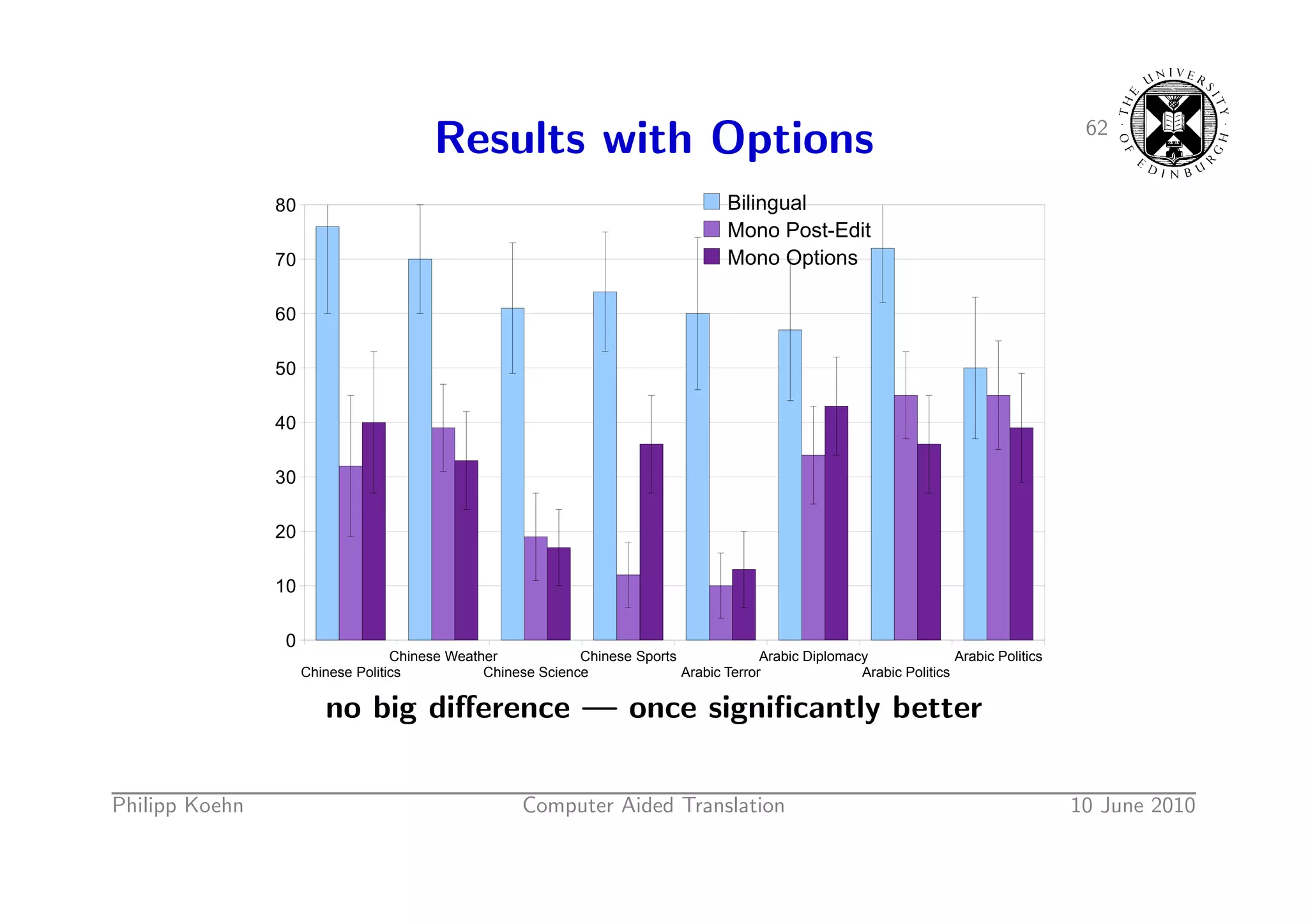 90. 90. 62 Results with Options 80 Bilingual Mono Post-Edit 70 Mono Options 60 50 40 30 20 10 0 Chinese Weather Chinese Sports Arabic Diplomacy Arabic Politics Chinese Politics Chinese Science Arabic Terror Arabic Politics no big difference — once significantly better Philipp Koehn Computer Aided Translation 10 June 2010
