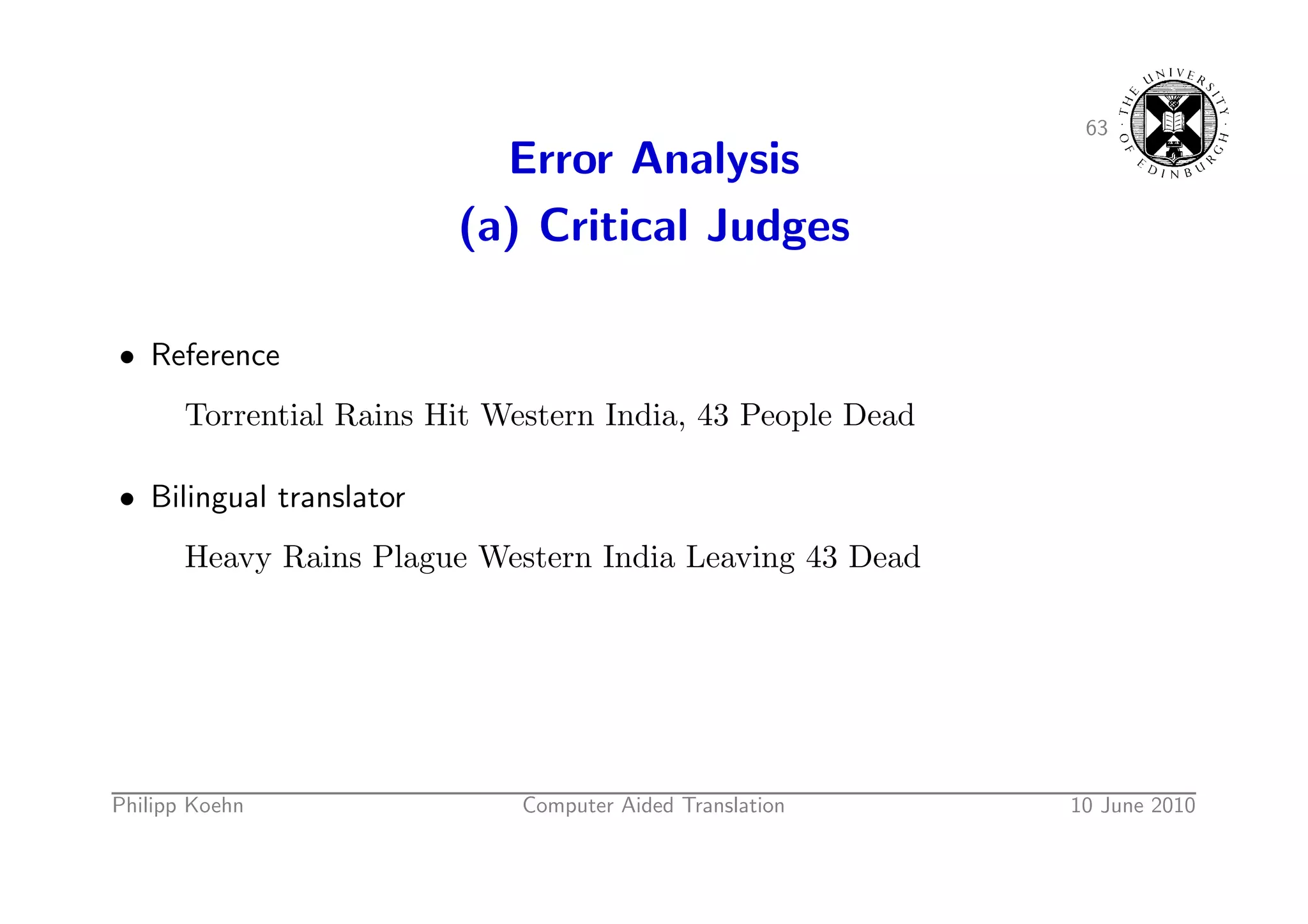 91. 91. 63 Error Analysis (a) Critical Judges • Reference Torrential Rains Hit Western India, 43 People Dead • Bilingual translator Heavy Rains Plague Western India Leaving 43 Dead Philipp Koehn Computer Aided Translation 10 June 2010