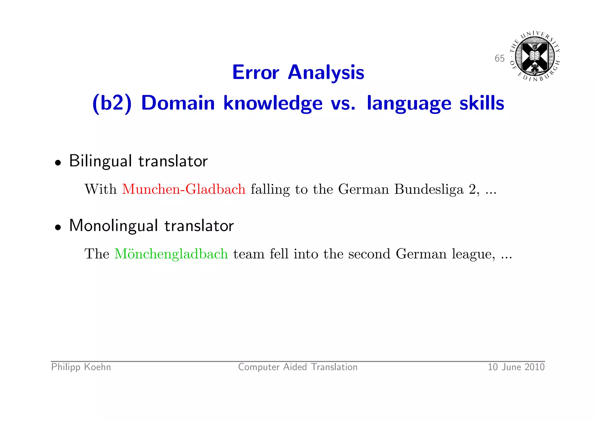 93. 93. 65 Error Analysis (b2) Domain knowledge vs. language skills • Bilingual translator With Munchen-Gladbach falling to the German Bundesliga 2, ... • Monolingual translator The M¨nchengladbach team fell into the second German league, ... o Philipp Koehn Computer Aided Translation 10 June 2010