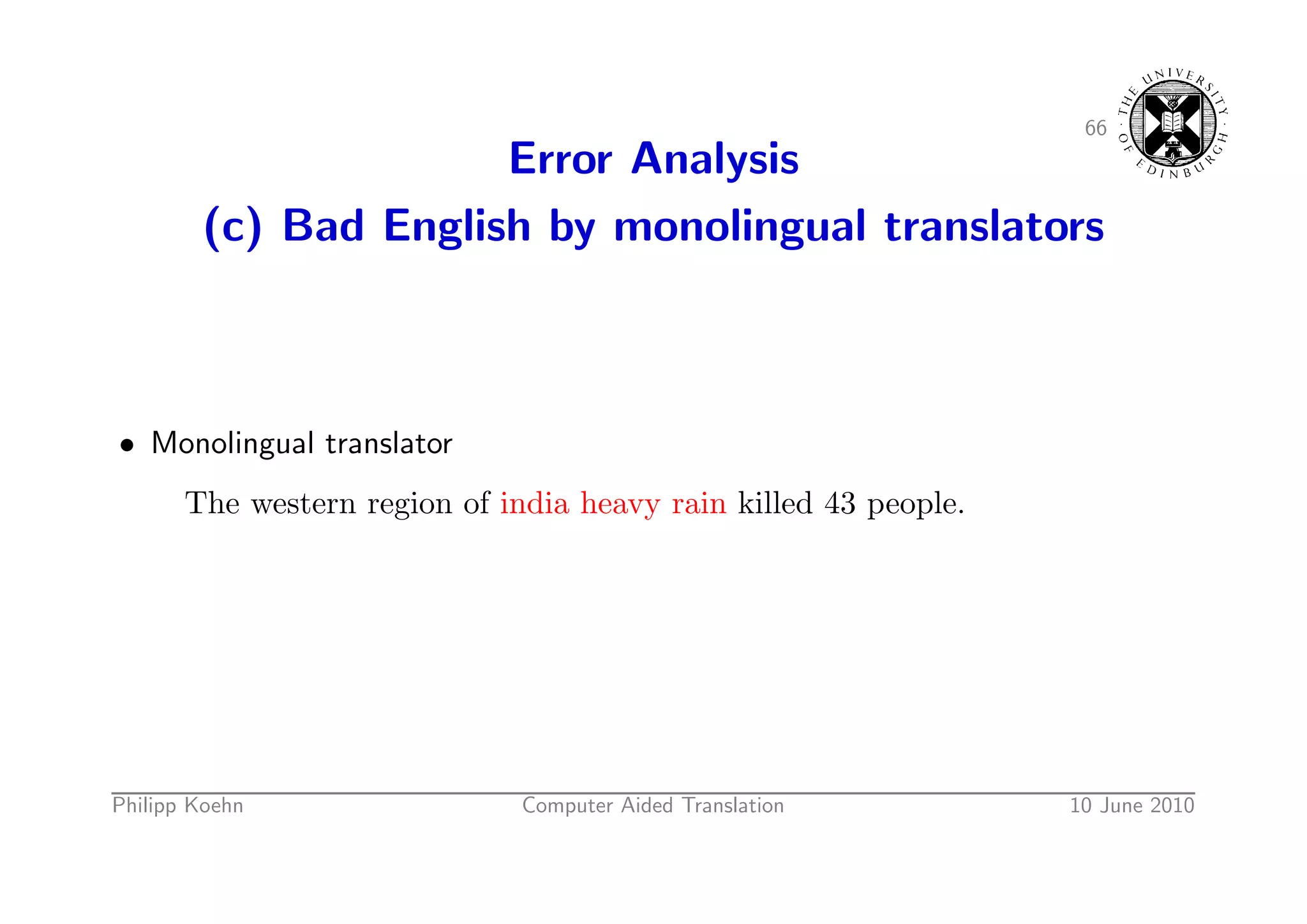 94. 94. 66 Error Analysis (c) Bad English by monolingual translators • Monolingual translator The western region of india heavy rain killed 43 people. Philipp Koehn Computer Aided Translation 10 June 2010