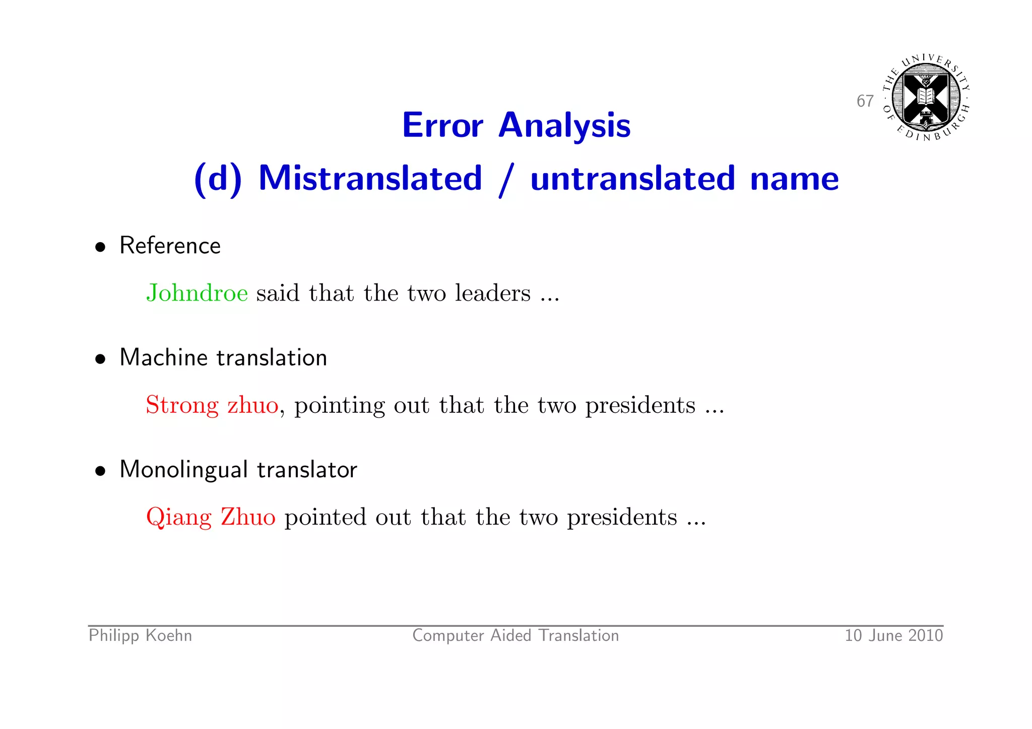 95. 95. 67 Error Analysis (d) Mistranslated / untranslated name • Reference Johndroe said that the two leaders ... • Machine translation Strong zhuo, pointing out that the two presidents ... • Monolingual translator Qiang Zhuo pointed out that the two presidents ... Philipp Koehn Computer Aided Translation 10 June 2010