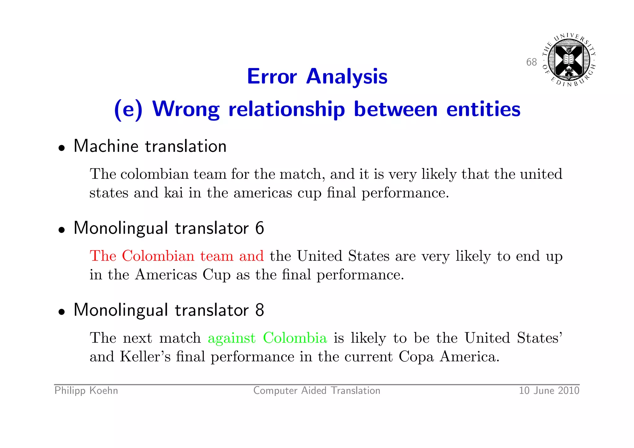 96. 96. 68 Error Analysis (e) Wrong relationship between entities • Machine translation The colombian team for the match, and it is very likely that the united states and kai in the americas cup final performance. • Monolingual translator 6 The Colombian team and the United States are very likely to end up in the Americas Cup as the final performance. • Monolingual translator 8 The next match against Colombia is likely to be the United States’ and Keller’s final performance in the current Copa America. Philipp Koehn Computer Aided Translation 10 June 2010