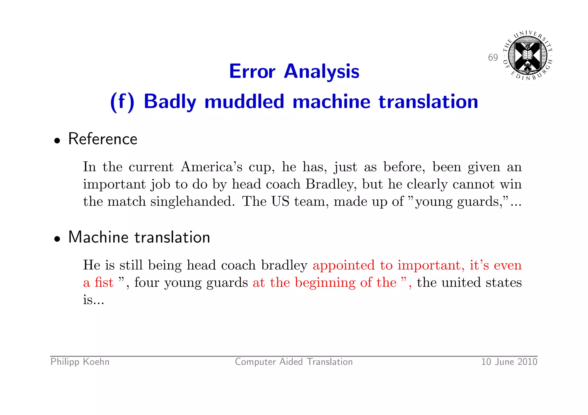 97. 97. 69 Error Analysis (f) Badly muddled machine translation • Reference In the current America’s cup, he has, just as before, been given an important job to do by head coach Bradley, but he clearly cannot win the match singlehanded. The US team, made up of ”young guards,”... • Machine translation He is still being head coach bradley appointed to important, it’s even a fist ”, four young guards at the beginning of the ”, the united states is... Philipp Koehn Computer Aided Translation 10 June 2010
