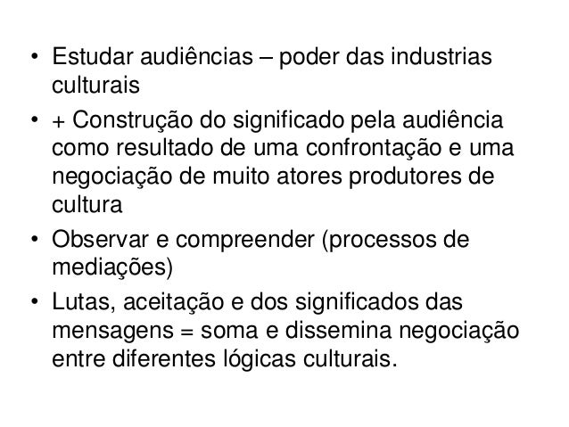 • Estudar audiências – poder das industrias  culturais• + Construção do significado pela audiência  como resultado de uma ...