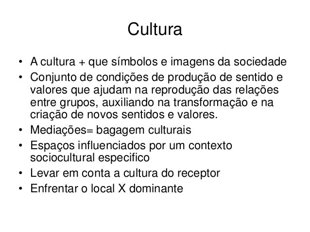 Cultura• A cultura + que símbolos e imagens da sociedade• Conjunto de condições de produção de sentido e  valores que ajud...