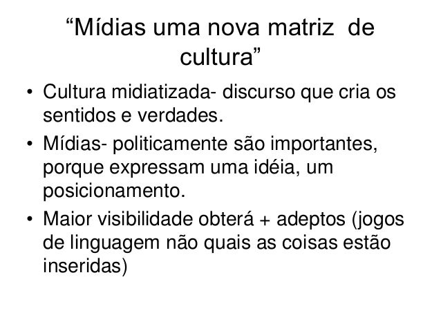 “Mídias uma nova matriz de              cultura”• Cultura midiatizada- discurso que cria os  sentidos e verdades.• Mídias-...