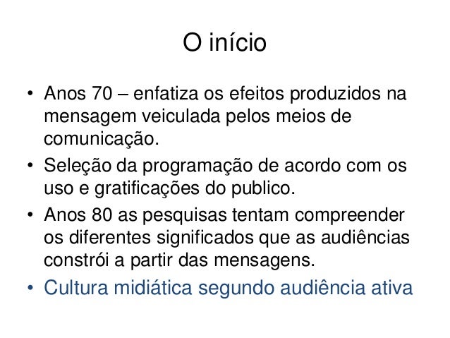O início• Anos 70 – enfatiza os efeitos produzidos na  mensagem veiculada pelos meios de  comunicação.• Seleção da program...