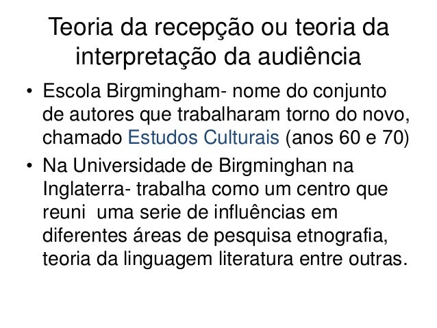 Teoria da recepção ou teoria da    interpretação da audiência• Escola Birgmingham- nome do conjunto  de autores que trabal...