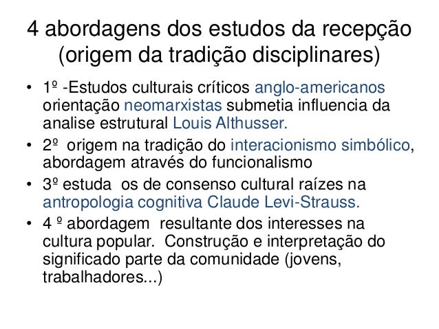 5. 5. 4 abordagens dos estudos da recepção (origem da tradição disciplinares)• 1º -Estudos culturais críticos anglo-americanos orientação neomarxistas submetia influencia da analise estrutural Louis Althusser.• 2º origem na tradição do interacionismo simbólico, abordagem através do funcionalismo• 3º estuda os de consenso cultural raízes na antropologia cognitiva Claude Levi-Strauss.• 4 º abordagem resultante dos interesses na cultura popular. Construção e interpretação do significado parte da comunidade (jovens, trabalhadores...)