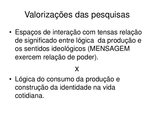 6. 6. Valorizações das pesquisas• Espaços de interação com tensas relação de significado entre lógica da produção e os sentidos ideológicos (MENSAGEM exercem relação de poder). x• Lógica do consumo da produção e construção da identidade na vida cotidiana.