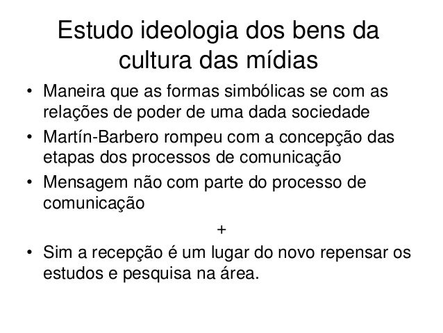 8. 8. Estudo ideologia dos bens da cultura das mídias• Maneira que as formas simbólicas se com as relações de poder de uma dada sociedade• Martín-Barbero rompeu com a concepção das etapas dos processos de comunicação• Mensagem não com parte do processo de comunicação +• Sim a recepção é um lugar do novo repensar os estudos e pesquisa na área.