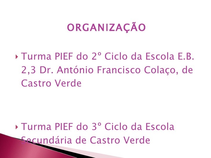 23. 53. <ul><li>ORGANIZAÇÃO </li></ul><ul><li>Turma PIEF do 2º Ciclo da Escola E.B. 2,3 Dr. António Francisco Colaço, de Castro Verde </li></ul><ul><li>Turma PIEF do 3º Ciclo da Escola Secundária de Castro Verde </li></ul>