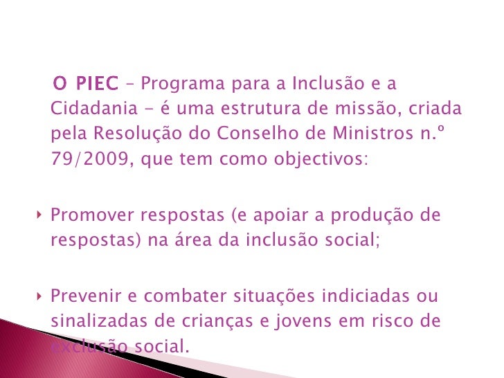 24. 54. <ul><li>O PIEC – Programa para a Inclusão e a Cidadania - é uma estrutura de missão, criada pela Resolução do Conselho de Ministros n.º 79/2009, que tem como objectivos: </li></ul><ul><li>Promover respostas (e apoiar a produção de respostas) na área da inclusão social; </li></ul><ul><li>Prevenir e combater situações indiciadas ou sinalizadas de crianças e jovens em risco de exclusão social. </li></ul>