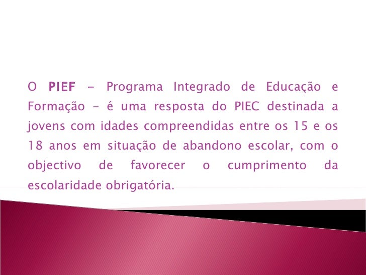 25. 55. O PIEF – Programa Integrado de Educação e Formação - é uma resposta do PIEC destinada a jovens com idades compreendidas entre os 15 e os 18 anos em situação de abandono escolar, com o objectivo de favorecer o cumprimento da escolaridade obrigatória.