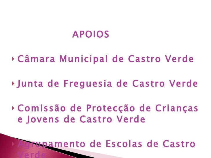 26. 56. <ul><li>APOIOS </li></ul><ul><li>Câmara Municipal de Castro Verde </li></ul><ul><li>Junta de Freguesia de Castro Verde </li></ul><ul><li>Comissão de Protecção de Crianças e Jovens de Castro Verde </li></ul><ul><li>Agrupamento de Escolas de Castro Verde </li></ul>