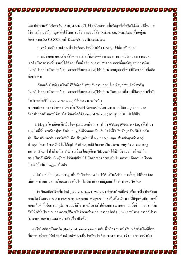 10. 10. และประสานสื่อให้ตรงกัน, XDI, สามารถเปิดใช้งานใหม่ของชั้นข้อมูลที่เชื่อถือได้แลกเปลี่ยนการ ใช้งาน มีการสร้างกุญแจซึ่งให้ในการบล็อกเลเยอร์นี้คือ I-names และ I-numbers (ขึ้นอยู่กับ ข้อกาหนด OASIS XRI), หน้า Dataweb และ link contracts การสร้างเครือข่ายสังคมเว็บไซต์ออนไลน์โดยใช้ FOAF ถูกใช้ตั้งแต่ปี 2000 การเปรียบเทียบเว็บไซต์สังคมออนไลน์ที่ดีที่สุดคือระบบธนาคารทั่วโลกและระบบบัตร เครดิต โครงสร้างพื้นฐานนี้ได้พัฒนาขึ้นเพื่ออานวยความสะดวกแลกเปลี่ยนข้อมูลทางการเงิน โดยทั่วไปหมายถึงการสร้างการแลกเปลี่ยนระหว่างผู้ให้บริการโดยบุคคลที่สามที่มีความน่าเชื่อถือ คือธนาคาร สังคมเว็บไซต์ออนไลน์ใช้วิธีเดียวกันสาหรับการแลกเปลี่ยนข้อมูลส่วนตัวที่สาคัญ โดยทั่วไปหมายถึงการสร้างการแลกเปลี่ยนระหว่างผู้ให้บริการ โดยบุคคลที่สามที่มีความน่าเชื่อถือ โซเชียลเน็ตเวิร์ค (Social Network) มีกี่ประเภท อะไรบ้าง การจัดประเภทของโซเชียลเน็ตเวิร์ค (Social Network) นั้นสามารถแยกได้ตามรูปแบบ และ วัตถุประสงค์ในการใช้งานโซเชียลเน็ตเวิร์ค (Social Network) ตามรูปแบบ แบ่งได้เป็น 1. Blog หรือ บล็อก คือเว็บไซต์รูปแบบหนึ่ง มาจากคาว่า Weblog (Website + Log) ซึ่งคาว่า Log ในที่นี้หมายถึง “ปูม” ดังนั้น Blog จึงมีลักษณะเป็นเว็บไซต์ที่จัดเก็บข้อมูลด้วยวิธีเดียวกับ ปูม มีการเรียงลาดับตามวันที่บันทึก ข้อมูลใหม่ที่ Post จะอยู่บนสุด ส่วนข้อมูลเก่าจะอยู่ ล่างสุด โดยบล็อกสมัยนี้ไม่ได้อยู่ลาพังเดี่ยวๆ แต่มีลักษณะเป็น Community ที่รวบรวม Blog หลายๆ Blog เข้าไว้ด้วยกัน สามารถเชื่อมโยงผู้เขียน (Blogger) ได้เป็นสังคมขนาดใหญ่ ใน ขณะเดียวกันก็เชื่อมโยงผู้อ่านไว้กับผู้เขียนได้ โดยสามารถคอมเม้นต์บทความ ติดตาม หรือกด โหวตได้ เช่น Blogger เป็นต้น 2. ไมโครบล็อก (Microblog) เป็นเว็บไซต์ขนาดเล็ก ใช้สาหรับส่งข้อความสั้นๆ ไม่กี่ประโยค เพื่อบอกถึงสถานการณ์ และความเป็นไป ไมโครบล็อกที่มีผู้นิยมใช้บริการ เช่น Twitter 3. โซเชียลเน็ตเวิร์คเว็บไซต์ ( Social Network Website) คือเว็บไซต์ที่สร้างขึ้นมาเพื่อเป็นสังคม ออนไลน์โดยเฉพาะ เช่น Facebook, Linkedin, Myspace, Hi5 เป็นต้น เว็บพวกนี้มีจุดเด่นที่การแชร์ คอนเท้นต์ ทั้งข้อความ รูปภาพ และวีดีโอ บางเว็บรวมไปถึงบทความ เพลง และลิ้งค์ นอกจากนั้น ยังมีฟังก์ชั่นในการแสดงความรู้สึก หรือมีส่วนร่วม เช่น การกดไลค์ ( Like) การโหวต การอภิปราย (Discuss) และการแสดงความคิดเห็น เป็นต้น 4. เว็บโซเชียลบุ๊คมาร์ค (Bookmark Social Site) เป็นเว็บที่ให้เราเก็บหน้าเว็บ หรือเว็บไซต์ที่เรา ชื่นชอบ เพื่อเอาไว้เข้าชมทีหลัง แต่พอมาเป็นโซเชียลไซต์ เราจะสามารถแชร์ URL ของหน้าเว็บ