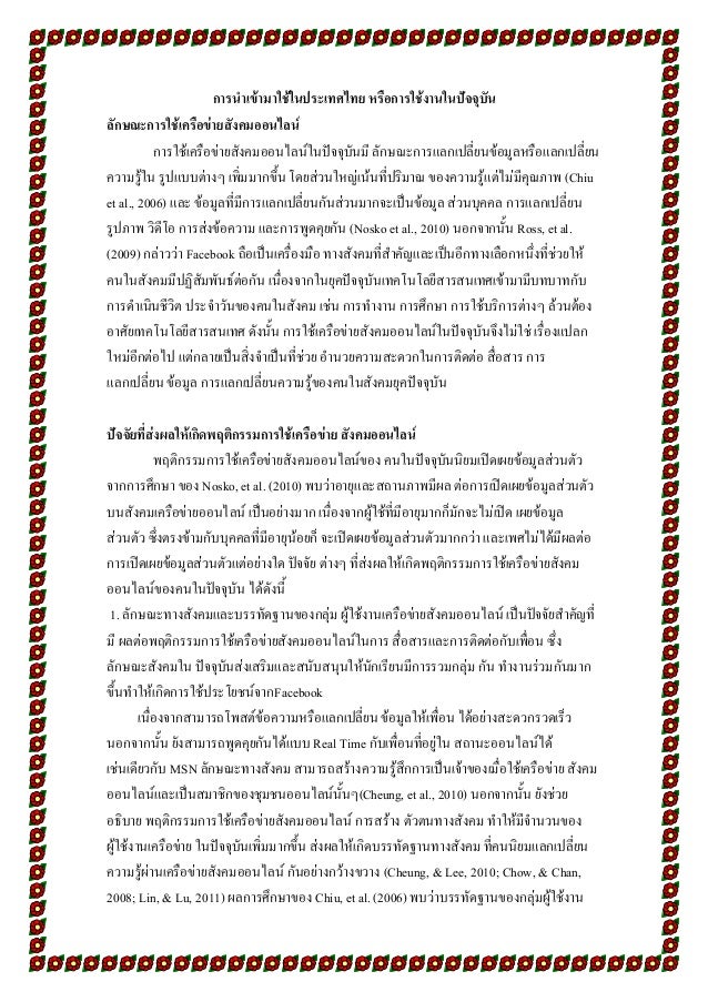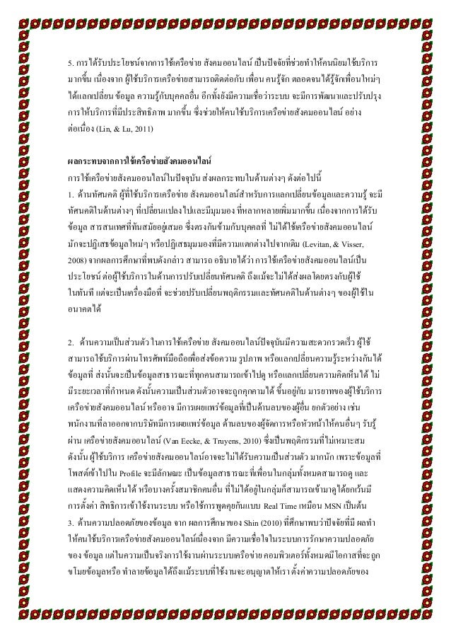15. 15. 5. การได้รับประโยชน์จากการใช้เครือข่าย สังคมออนไลน์ เป็นปัจจัยที่ช่วยทาให้คนนิยมใช้บริการ มากขึ้น เนื่องจาก ผู้ใช้บริการเครือข่ายสามารถติดต่อกับ เพื่อน คนรู้จัก ตลอดจนได้รู้จักเพื่อนใหม่ๆ ได้แลกเปลี่ยน ข้อมูล ความรู้กับบุคคลอื่น อีกทั้งยังมีความเชื่อว่าระบบ จะมีการพัฒนาและปรับปรุง การให้บริการที่มีประสิทธิภาพ มากขึ้น ซึ่งช่วยให้คนใช้บริการเครือข่ายสังคมออนไลน์ อย่าง ต่อเนื่อง (Lin, & Lu, 2011) ผลกระทบจากการใช้เครือข่ายสังคมออนไลน์ การใช้เครือข่ายสังคมออนไลน์ในปัจจุบัน ส่งผลกระทบในด้านต่างๆ ดังต่อไปนี้ 1. ด้านทัศนคติ ผู้ที่ใช้บริการเครือข่าย สังคมออนไลน์สาหรับการแลกเปลี่ยนข้อมูลและความรู้ จะมี ทัศนคติในด้านต่างๆ ที่เปลี่ยนแปลงไปและมีมุมมอง ที่หลากหลายเพิ่มมากขึ้น เนื่องจากการได้รับ ข้อมูล สารสนเทศที่ทันสมัยอยู่เสมอ ซึ่งตรงกันข้ามกับบุคคลที่ ไม่ได้ใช้เครือข่ายสังคมออนไลน์ มักจะปฏิเสธข้อมูลใหม่ๆ หรือปฏิเสธมุมมองที่มีความแตกต่างไปจากเดิม (Levitan, & Visser, 2008) จากผลการศึกษาที่พบดังกล่าว สามารถ อธิบายได้ว่า การใช้เครือข่ายสังคมออนไลน์เป็น ประโยชน์ ต่อผู้ใช้บริการในด้านการปรับเปลี่ยนทัศนคติ ถึงแม้จะไม่ได้ส่งผลโดยตรงกับผู้ใช้ ในทันที แต่จะเป็นเครื่องมือที่ จะช่วยปรับเปลี่ยนพฤติกรรมและทัศนคติในด้านต่างๆ ของผู้ใช้ใน อนาคตได้ 2. ด้านความเป็นส่วนตัว ในการใช้เครือข่าย สังคมออนไลน์ปัจจุบันมีความสะดวกรวดเร็ว ผู้ใช้ สามารถใช้บริการผ่านโทรศัพท์มือถือเพื่อส่งข้อความ รูปภาพ หรือแลกเปลี่ยนความรู้ระหว่างกันได้ ข้อมูลที่ ส่งนั้นจะเป็นข้อมูลสาธารณะที่ทุกคนสามารถเข้าไปดู หรือแลกเปลี่ยนความคิดเห็นได้ ไม่ มีระยะเวลาที่กาหนด ดังนั้นความเป็นส่วนตัวอาจจะถูกคุกคามได้ ขึ้นอยู่กับ มารยาทของผู้ใช้บริการ เครือข่ายสังคมออนไลน์ หรืออาจ มีการเผยแพร่ข้อมูลที่เป็นด้านลบของผู้อื่น ยกตัวอย่าง เช่น พนักงานที่ลาออกจากบริษัทมีการเผยแพร่ข้อมูล ด้านลบของผู้จัดการหรือหัวหน้าให้คนอื่นๆ รับรู้ ผ่าน เครือข่ายสังคมออนไลน์ (Van Eecke, & Truyens, 2010) ซึ่งเป็นพฤติกรรมที่ไม่เหมาะสม ดังนั้น ผู้ใช้บริการ เครือข่ายสังคมออนไลน์อาจจะไม่ได้รับความเป็นส่วนตัว มากนัก เพราะข้อมูลที่ โพสต์เข้าไปใน Profile จะมีลักษณะ เป็นข้อมูลสาธารณะที่เพื่อนในกลุ่มทั้งหมดสามารถดู และ แสดงความคิดเห็นได้ หรือบางครั้งสมาชิกคนอื่น ที่ไม่ได้อยู่ในกลุ่มก็สามารถเข้ามาดูได้ยกเว้นมี การตั้งค่า สิทธิการเข้าใช้งานระบบ หรือใช้การพูดคุยกันแบบ Real Time เหมือน MSN เป็นต้น 3. ด้านค