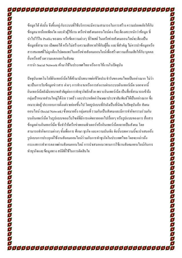 16. 16. ข้อมูลได้ ดังนั้น จึงขึ้นอยู่ กับระบบที่ใช้บริการจะมีความสามารถในการสร้าง ความปลอดภัยให้กับ ข้อมูลมากน้อยเพียงใด และตัวผู้ใช้งาน เครือข่ายสังคมออนไลน์เอง ก็จะต้องตระหนักว่าข้อมูล ที่ นาไปไว้ใน Profile ของตน หรือข้อความต่างๆ ที่โพสต์ ในเครือข่ายสังคมออนไลน์จะต้องเป็น ข้อมูลที่สามารถ เปิดเผยได้ หรือไม่สร้างความเสียหายให้กับผู้อื่น และที่สาคัญ ไม่ควรนาข้อมูลหรือ สารสนเทศที่ไม่ถูกต้องไปเผยแพร่ในเครือข่ายสังคมออนไลน์เพื่อสร้างความเสื่อมเสียให้กับ บุคคล อื่นหรือสร้างความแตกแยกในสังคม การนา Social Network เข้ามาใช้ในประเทศไทย หรือการใช้งานในปัจจุบัน ปัจจุบันเทคโนโลยีอินเทอร์เน็ตได้เข้ามามีบทบาทต่อชีวิตประจาวันของคนไทยเป็นอย่างมาก ไม่ว่า จะเป็นการรับข้อมูลข่าวสาร ต่างๆ การทางานหรือการส่งงานผ่านระบบอินเทอร์เน็ต นอกจากนี้ อินเทอร์เน็ตยังมีบทบาทสาคัญต่อการทาธุรกิจอีกด้วย เพราะอินเทอร์เน็ต เป็นสื่อที่สามารถเข้าถึง กลุ่มเป้าหมายส่วนใหญ่ได้ง่าย รวดเร็ว และประหยัดค่าโฆษณาประชาสัมพันธ์ได้เป็นอย่างมาก ซึ่ง เหมาะต่อผู้ ประกอบการตั้งแต่รายย่อยขึ้นไป โดยรูปแบบที่กาลังเป็นที่นิยมในปัจจุบันคือ สังคม ออนไลน์ (Social Network) ซึ่งหมายถึง กลุ่มคนที่ รวมกันเป็นสังคมและมีการทากิจกรรมร่วมกัน บนอินเทอร์เน็ต ในรูปแบบของเว็บไซต์ที่มีการแผ่ขยายออกไปเรื่อยๆ หรือรูปแบบของการ สื่อสาร ข้อมูลผ่านอินเทอร์เน็ต ซึ่งทาให้เครือข่ายคอมพิวเตอร์หรืออินเทอร์เน็ตกลายเป็นสังคม โดย สามารถทากิจกรรมต่างๆ ทั้งเพื่อการ ศึกษา ธุรกิจ และความบันเทิง ดังนั้นบทความนี้จะนาเสนอถึง รูปแบบการประยุกต์ใช้งานสังคมออนไลน์ร่วมกับการทาธุรกิจในประเทศไทย โดยจะกล่าวถึง กระแสการทาการตลาดผ่านสังคมออนไลน์ การนาเสนอแนวทางการใช้งานสังคมออนไลน์กับการ ทาธุรกิจและข้อมูลทาง สถิติที่ใช้ในการตัดสินใจ