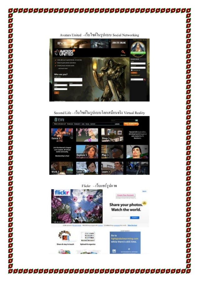 8. 8. Avatars United –เว็บไซต์ในรูปแบบ Social Networking Second Life – เว็บไซต์ในรูปแบบโลกเสมือนจริง Virtual Reality Flickr – เว็บแชร์รูปภาพ
