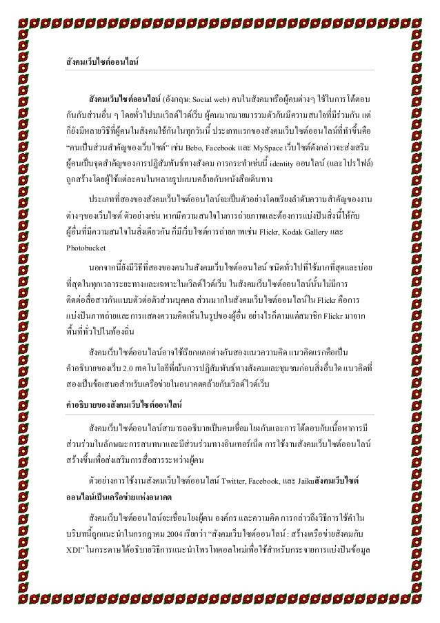 9. 9. สังคมเว็บไซต์ออนไลน์ สังคมเว็บไซต์ออนไลน์ (อังกฤษ: Social web) คนในสังคมหรือผู้คนต่างๆ ใช้ในการโต้ตอบ กันกับส่วนอื่น ๆ โดยทั่วไปบนเวิลด์ไวด์เว็บ ผู้คนมากมายมารวมตัวกันมีความสนใจที่มีร่วมกัน แต่ ก็ยังมีหลายวิธีที่ผู้คนในสังคมใช้กันในทุกวันนี้ ประเภทแรกของสังคมเว็บไซต์ออนไลน์ที่ทาขึ้นคือ “คนเป็นส่วนสาคัญของเว็บไซต์” เช่น Bebo, Facebook และ MySpace เว็บไซต์ดังกล่าวจะส่งเสริม ผู้คนเป็นจุดสาคัญของการปฏิสัมพันธ์ทางสังคม การกระทาเช่นนี้ identity ออนไลน์ (และโปรไฟล์) ถูกสร้างโดยผู้ใช้แต่ละคนในหลายรูปแบบคล้ายกับหนังสือเดินทาง ประเภทที่สองของสังคมเว็บไซต์ออนไลน์จะเป็นตัวอย่างโดยเรียงลาดับความสาคัญของงาน ต่างๆของเว็บไซต์ ตัวอย่างเช่น หากมีความสนใจในการถ่ายภาพและต้องการแบ่งปันสิ่งนี้ให้กับ ผู้อื่นที่มีความสนใจในสิ่งเดียวกัน ก็มีเว็บไซต์การถ่ายภาพเช่น Flickr, Kodak Gallery และ Photobucket นอกจากนี้ยังมีวิธีที่สองของคนในสังคมเว็บไซต์ออนไลน์ ชนิดทั่วไปที่ใช้มากที่สุดและบ่อย ที่สุดในทุกเวลาระยะทางและเฉพาะในเวิลด์ไวด์เว็บ ในสังคมเว็บไซต์ออนไลน์นั้นไม่มีการ ติดต่อสื่อสารกันแบบตัวต่อตัวส่วนบุคคล ส่วนมากในสังคมเว็บไซต์ออนไลน์ใน Flickr คือการ แบ่งปันภาพถ่ายและการแสดงความคิดเห็นในรูปของผู้อื่น อย่างไรก็ตามแต่สมาชิก Flickr มาจาก พื้นที่ทั่วไปในท้องถิ่น สังคมเว็บไซต์ออนไลน์อาจใช้เรียกแตกต่างกันสองแนวความคิด แนวคิดแรกคือเป็น คาอธิบายของเว็บ 2.0 เทคโนโลยีที่เน้นการปฏิสัมพันธ์ทางสังคมและชุมชนก่อนสิ่งอื่นใด แนวคิดที่ สองเป็นข้อเสนอสาหรับเครือข่ายในอนาคตคล้ายกับเวิลด์ไวด์เว็บ คาอธิบายของสังคมเว็บไซต์ออนไลน์ สังคมเว็บไซต์ออนไลน์สามารถอธิบายเป็นคนเชื่อมโยงกันและการโต้ตอบกับเนื้อหาการมี ส่วนร่วมในลักษณะการสนทนาและมีส่วนร่วมทางอินเทอร์เน็ต การใช้งานสังคมเว็บไซต์ออนไลน์ สร้างขึ้นเพื่อส่งเสริมการสื่อสารระหว่างผู้คน ตัวอย่างการใช้งานสังคมเว็บไซต์ออนไลน์ Twitter, Facebook, และ Jaikuสังคมเว็บไซต์ ออนไลน์เป็นเครือข่ายแห่งอนาคต สังคมเว็บไซต์ออนไลน์จะเชื่อมโยงผู้คน องค์กร และความคิด การกล่าวถึงวิธีการใช้คาใน บริบทนี้ถูกแนะนาในกรกฎาคม 2004 เรียกว่า “สังคมเว็บไซต์ออนไลน์ : สร้างเครือข่ายสังคมกับ XDI” ในกระดาษได้อธิบายวิธีการแนะนาโพรโทคอลใหม่เพื่อใช้สาหรับกระจายการแบ่งปันข้อมูล
