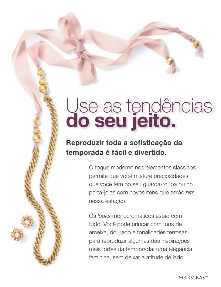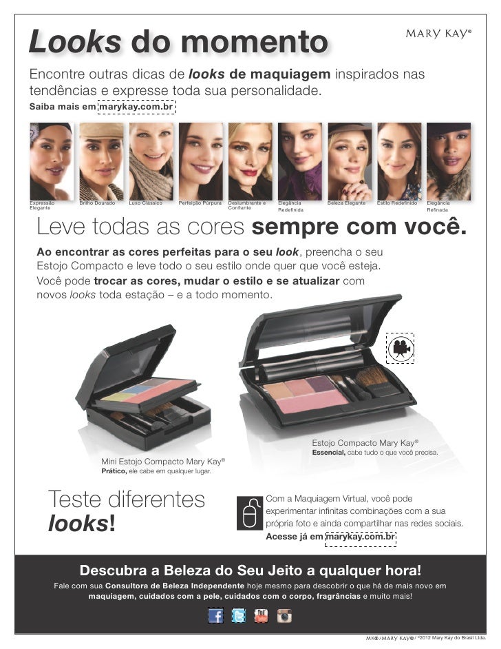 10. 10. Looks do momentoEncontre outras dicas de looks de maquiagem inspirados nastendências e expresse toda sua personalidade.Saiba mais em marykay.com.brExpressão Brilho Dourado Luxo Clássico Perfeição Púrpura Deslumbrante e Elegância Beleza Elegante Estilo Redefinido ElegânciaElegante Confiante Redefinida Refinada Leve todas as cores sempre com você. Ao encontrar as cores perfeitas para o seu look, preencha o seu Estojo Compacto e leve todo o seu estilo onde quer que você esteja. Você pode trocar as cores, mudar o estilo e se atualizar com novos looks toda estação – e a todo momento. Estojo Compacto Mary Kay® Essencial, cabe tudo o que você precisa. Mini Estojo Compacto Mary Kay® Prático, ele cabe em qualquer lugar. Teste diferentes Com a Maquiagem Virtual, você pode experimentar infinitas combinações com a sua looks! própria foto e ainda compartilhar nas redes sociais. Acesse já em marykay.com.br Descubra a Beleza do Seu Jeito a qualquer hora! Assista a Mary Encontre a Mary Kay no YouTube Kay no Facebook Fale com sua Consultora de Beleza Independente hoje mesmo para descobrir o que há de mais novo em maquiagem, cuidados com a pele, cuidados com o corpo, fragrâncias e muito mais! Assista a Mary Encontre a Siga a Mary Mary Assista a Mary Encontre a Mary Kay no YouTube Kay no Facebook Twitter YouTube Kay no Kay no Kay no Facebook / ©2012 Mary Kay do Brasil Ltda.