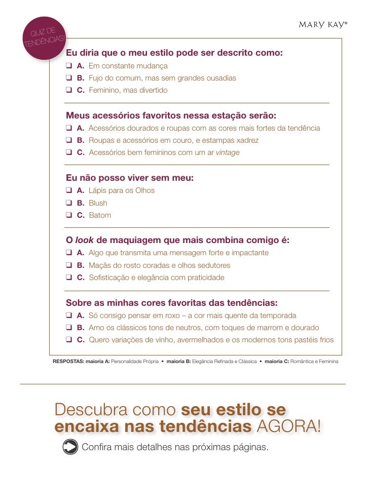 3. 3. E QUIZ D CIAS!TENDÊN Eu diria que o meu estilo pode ser descrito como: q A. Em constante mudança q B. Fujo do comum, mas sem grandes ousadias q C. Feminino, mas divertido Meus acessórios favoritos nessa estação serão: q A. Acessórios dourados e roupas com as cores mais fortes da tendência q B. Roupas e acessórios em couro, e estampas xadrez q C. Acessórios bem femininos com um ar vintage Eu não posso viver sem meu: q A. Lápis para os Olhos q B. Blush q C. Batom O look de maquiagem que mais combina comigo é: q A. Algo que transmita uma mensagem forte e impactante q B. Maçãs do rosto coradas e olhos sedutores q C. Sofisticação e elegância com praticidade Sobre as minhas cores favoritas das tendências: q A. Só consigo pensar em roxo – a cor mais quente da temporada q B. Amo os clássicos tons de neutros, com toques de marrom e dourado q C. Quero variações de vinho, avermelhados e os modernos tons pastéis frios RESPOSTAS: maioria A: Personalidade Própria • maioria B: Elegância Refinada e Clássica • maioria C: Romântica e Feminina Descubra como seu estilo se encaixa nas tendências AGORA! Confira mais detalhes nas próximas páginas.