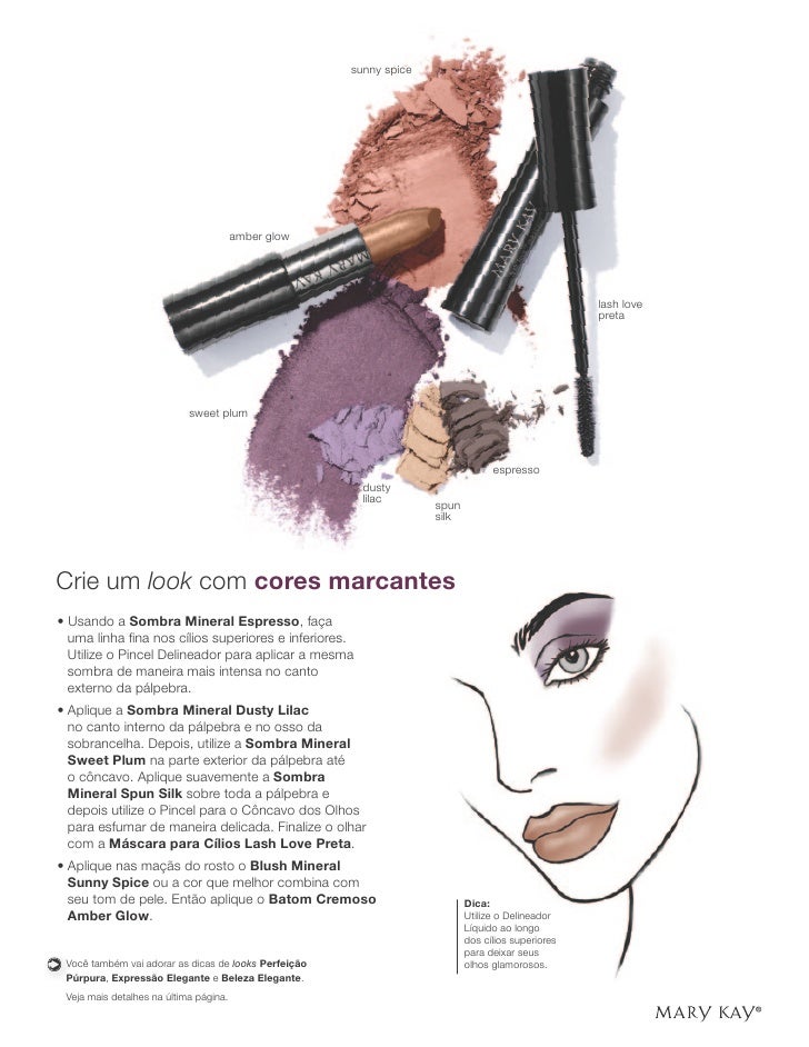 5. 5. sunny spice amber glow lash love preta sweet plum espresso dusty lilac spun silkCrie um look com cores marcantes• Usando a Sombra Mineral Espresso, faça uma linha fina nos cílios superiores e inferiores. Utilize o Pincel Delineador para aplicar a mesma sombra de maneira mais intensa no canto externo da pálpebra.• Aplique a Sombra Mineral Dusty Lilac no canto interno da pálpebra e no osso da sobrancelha. Depois, utilize a Sombra Mineral Sweet Plum na parte exterior da pálpebra até o côncavo. Aplique suavemente a Sombra Mineral Spun Silk sobre toda a pálpebra e depois utilize o Pincel para o Côncavo dos Olhos para esfumar de maneira delicada. Finalize o olhar com a Máscara para Cílios Lash Love Preta.• Aplique nas maçãs do rosto o Blush Mineral Sunny Spice ou a cor que melhor combina com seu tom de pele. Então aplique o Batom Cremoso Dica: Amber Glow. Utilize o Delineador Líquido ao longo dos cílios superiores para deixar seus Você também vai adorar as dicas de looks Perfeição olhos glamorosos. Púrpura, Expressão Elegante e Beleza Elegante. Veja mais detalhes na última página.