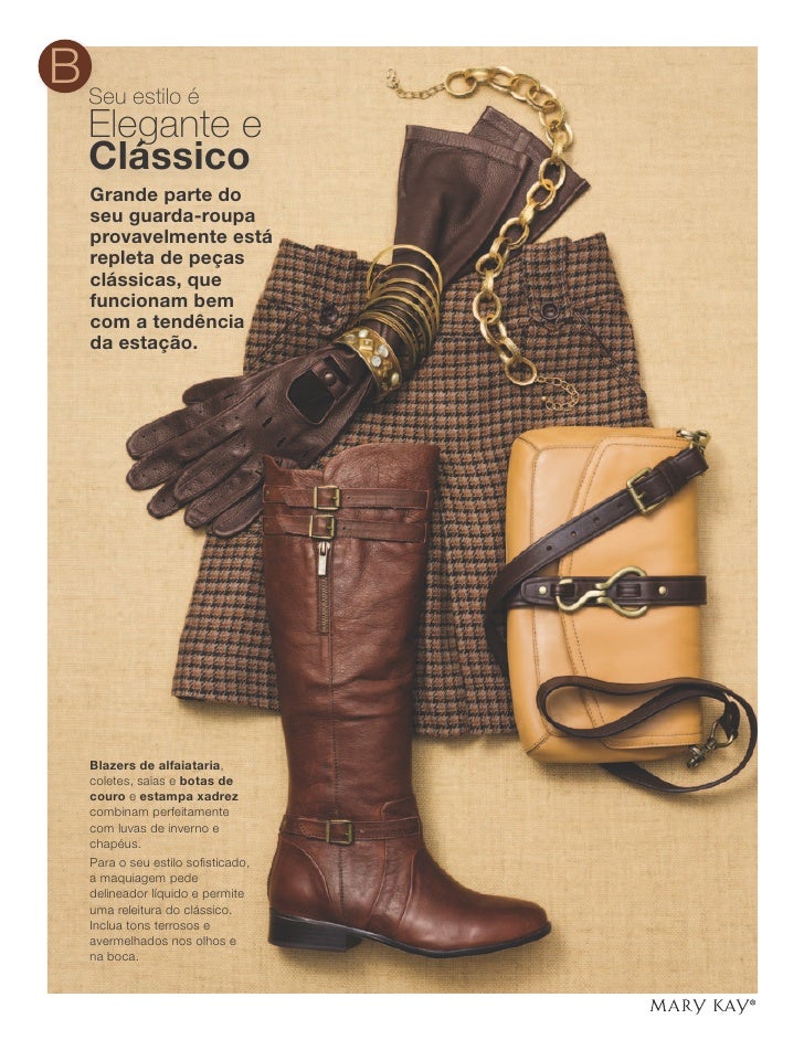 6. 6. B Seu estilo é Elegante e Clássico Grande parte do seu guarda-roupa provavelmente está repleta de peças clássicas, que funcionam bem com a tendência da estação. Blazers de alfaiataria, coletes, saias e botas de couro e estampa xadrez combinam perfeitamente com luvas de inverno e chapéus. Para o seu estilo sofisticado, a maquiagem pede delineador líquido e permite uma releitura do clássico. Inclua tons terrosos e avermelhados nos olhos e na boca.