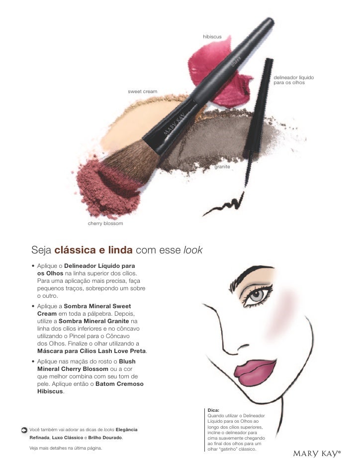 7. 7. hibiscus delineador líquido para os olhos sweet cream granite cherry blossomSeja clássica e linda com esse look• Aplique o Delineador Líquido para os Olhos na linha superior dos cílios. Para uma aplicação mais precisa, faça pequenos traços, sobrepondo um sobre o outro.• Aplique a Sombra Mineral Sweet Cream em toda a pálpebra. Depois, utilize a Sombra Mineral Granite na linha dos cílios inferiores e no côncavo utilizando o Pincel para o Côncavo dos Olhos. Finalize o olhar utilizando a Máscara para Cílios Lash Love Preta.• Aplique nas maçãs do rosto o Blush Mineral Cherry Blossom ou a cor que melhor combina com seu tom de pele. Aplique então o Batom Cremoso Hibiscus. Dica: Quando utilizar o Delineador Líquido para os Olhos ao longo dos cílios superiores,Você também vai adorar as dicas de looks Elegância incline o delineador paraRefinada, Luxo Clássico e Brilho Dourado. cima suavemente chegando ao final dos olhos para umVeja mais detalhes na última página. olhar “gatinho” clássico.