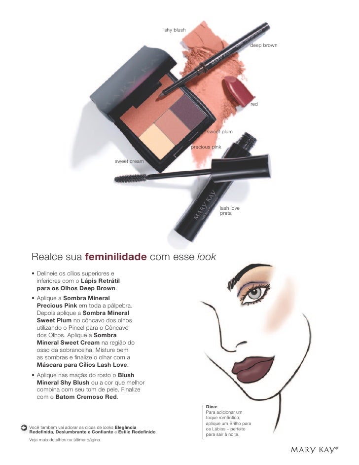 9. 9. shy blush deep brown red sweet plum precious pink sweet cream lash love preta Realce sua feminilidade com esse look • Delineie os cílios superiores e inferiores com o Lápis Retrátil para os Olhos Deep Brown. • Aplique a Sombra Mineral Precious Pink em toda a pálpebra. Depois aplique a Sombra Mineral Sweet Plum no côncavo dos olhos utilizando o Pincel para o Côncavo dos Olhos. Aplique a Sombra Mineral Sweet Cream na região do osso da sobrancelha. Misture bem as sombras e finalize o olhar com a Máscara para Cílios Lash Love. • Aplique nas maçãs do rosto o Blush Mineral Shy Blush ou a cor que melhor combina com seu tom de pele. Finalize com o Batom Cremoso Red. Dica: Para adicionar um toque romântico, aplique um Brilho paraVocê também vai adorar as dicas de looks Elegância os Lábios – perfeitoRedefinida, Deslumbrante e Confiante e Estilo Redefinido. para sair à noite.Veja mais detalhes na última página.
