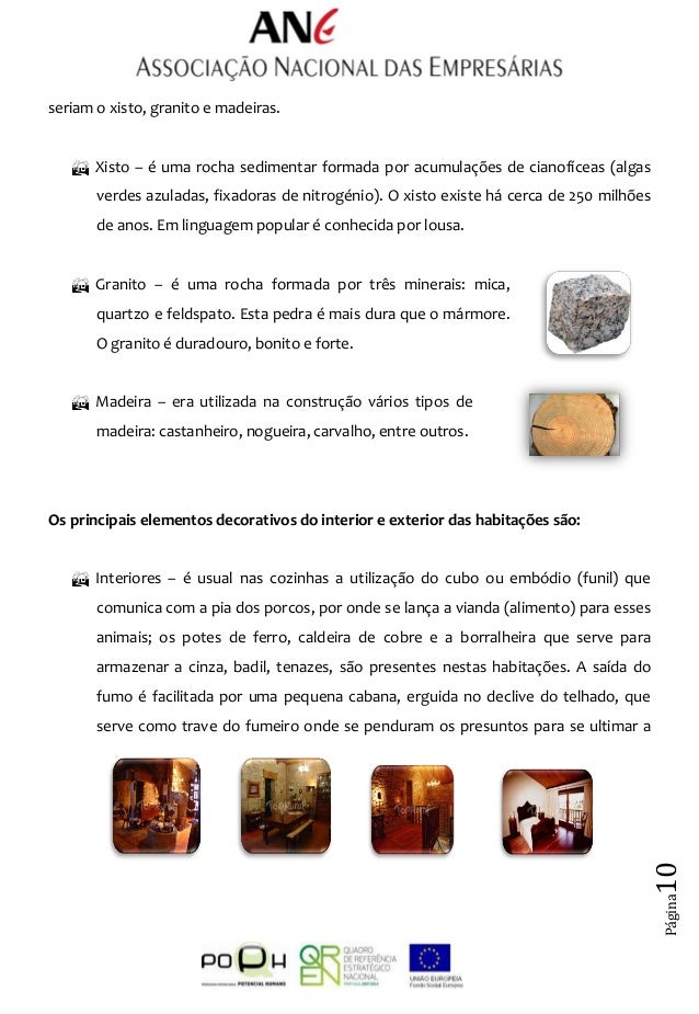 10. 10. Página10 seriam o xisto, granito e madeiras.  Xisto – é uma rocha sedimentar formada por acumulações de cianofíceas (algas verdes azuladas, fixadoras de nitrogénio). O xisto existe há cerca de 250 milhões de anos. Em linguagem popular é conhecida por lousa.  Granito – é uma rocha formada por três minerais: mica, quartzo e feldspato. Esta pedra é mais dura que o mármore. O granito é duradouro, bonito e forte.  Madeira – era utilizada na construção vários tipos de madeira: castanheiro, nogueira, carvalho, entre outros. Os principais elementos decorativos do interior e exterior das habitações são:  Interiores – é usual nas cozinhas a utilização do cubo ou embódio (funil) que comunica com a pia dos porcos, por onde se lança a vianda (alimento) para esses animais; os potes de ferro, caldeira de cobre e a borralheira que serve para armazenar a cinza, badil, tenazes, são presentes nestas habitações. A saída do fumo é facilitada por uma pequena cabana, erguida no declive do telhado, que serve como trave do fumeiro onde se penduram os presuntos para se ultimar a
