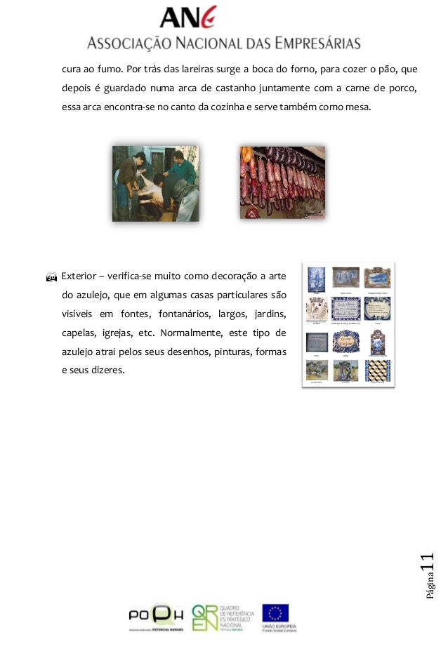 11. 11. Página11 cura ao fumo. Por trás das lareiras surge a boca do forno, para cozer o pão, que depois é guardado numa arca de castanho juntamente com a carne de porco, essa arca encontra-se no canto da cozinha e serve também como mesa.  Exterior – verifica-se muito como decoração a arte do azulejo, que em algumas casas particulares são visíveis em fontes, fontanários, largos, jardins, capelas, igrejas, etc. Normalmente, este tipo de azulejo atrai pelos seus desenhos, pinturas, formas e seus dizeres.