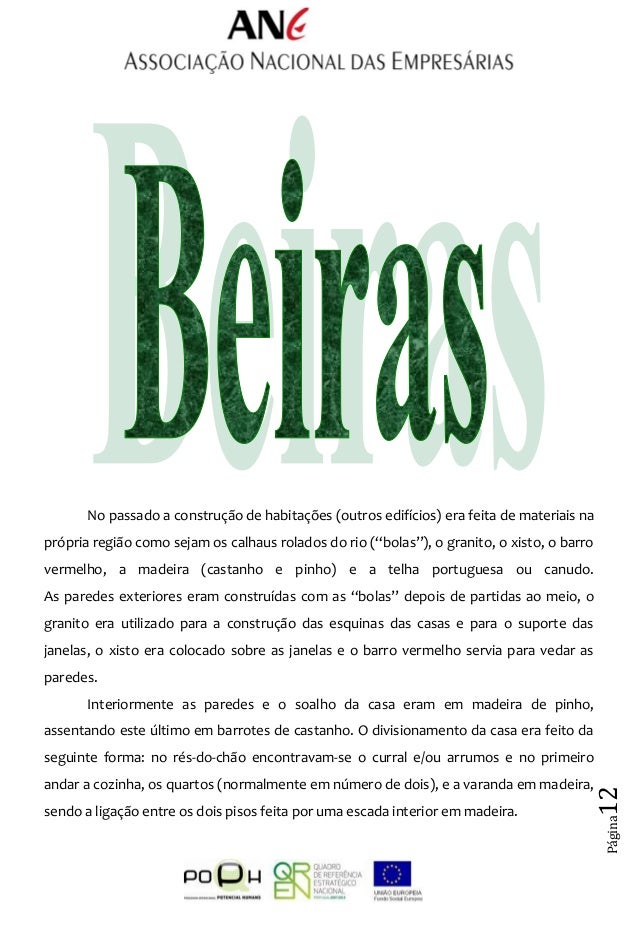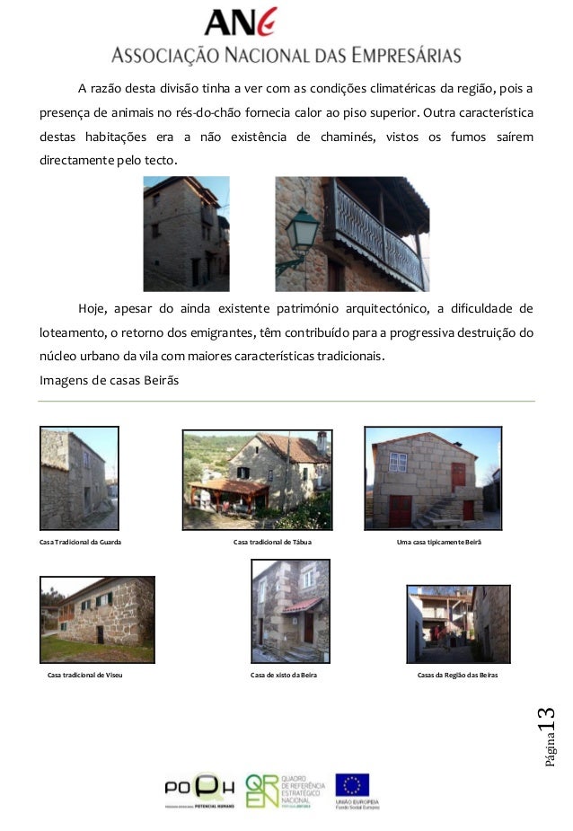13. 13. Página13 A razão desta divisão tinha a ver com as condições climatéricas da região, pois a presença de animais no rés-do-chão fornecia calor ao piso superior. Outra característica destas habitações era a não existência de chaminés, vistos os fumos saírem directamente pelo tecto. Hoje, apesar do ainda existente património arquitectónico, a dificuldade de loteamento, o retorno dos emigrantes, têm contribuído para a progressiva destruição do núcleo urbano da vila com maiores características tradicionais. Imagens de casas Beirãs Casa Tradicional da Guarda Casa tradicional de Tábua Uma casa tipicamente Beirã Casa tradicional de Viseu Casa de xisto da Beira Casas da Região das Beiras