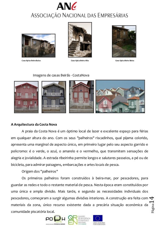 14. 14. Página14 Casa típica Beira Baixa Casa típica Beira Alta Casa típica Beira Baixa Imagens de casas Beirãs - CostaNova A Arquitectura da Costa Nova A praia da Costa Nova é um óptimo local de lazer e excelente espaço para férias em qualquer altura do ano. Com os seus "palheiros" riscadinhos, qual pijama colorido, apresenta uma marginal de aspecto único, em primeiro lugar pelo seu aspecto garrido e policromo: é o verde, o azul, o amarelo e o vermelho, que transmitem sensações de alegria e jovialidade. A estrada ribeirinha permite longos e salutares passeios, a pé ou de bicicleta, para admirar paisagens, embarcações e artes locais de pesca. Origem dos "palheiros" Os primeiros palheiros foram construídos à beira-mar, por pescadores, para guardar as redes e todo o restante material de pesca. Nesta época eram constituídos por uma única e ampla divisão. Mais tarde, e segundo as necessidades individuais dos pescadores, começaram a surgir algumas divisões interiores. A construção era feita com materiais da zona, único recurso existente dada a precária situação económica da comunidade piscatória local.