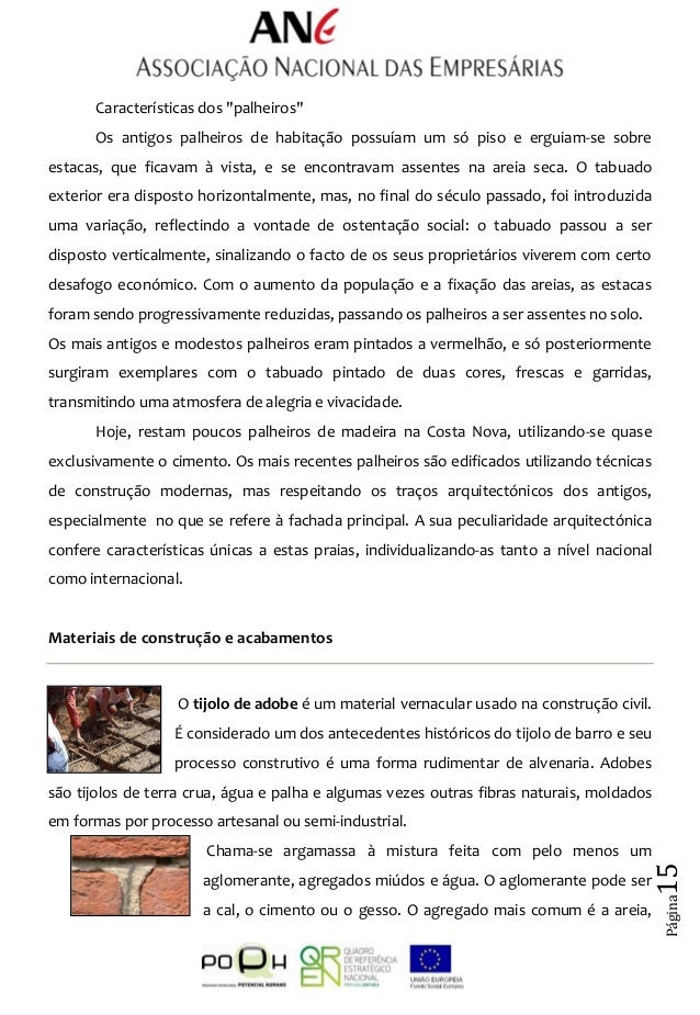 15. 15. Página15 Características dos "palheiros" Os antigos palheiros de habitação possuíam um só piso e erguiam-se sobre estacas, que ficavam à vista, e se encontravam assentes na areia seca. O tabuado exterior era disposto horizontalmente, mas, no final do século passado, foi introduzida uma variação, reflectindo a vontade de ostentação social: o tabuado passou a ser disposto verticalmente, sinalizando o facto de os seus proprietários viverem com certo desafogo económico. Com o aumento da população e a fixação das areias, as estacas foram sendo progressivamente reduzidas, passando os palheiros a ser assentes no solo. Os mais antigos e modestos palheiros eram pintados a vermelhão, e só posteriormente surgiram exemplares com o tabuado pintado de duas cores, frescas e garridas, transmitindo uma atmosfera de alegria e vivacidade. Hoje, restam poucos palheiros de madeira na Costa Nova, utilizando-se quase exclusivamente o cimento. Os mais recentes palheiros são edificados utilizando técnicas de construção modernas, mas respeitando os traços arquitectónicos dos antigos, especialmente no que se refere à fachada principal. A sua peculiaridade arquitectónica confere características únicas a estas praias, individualizando-as tanto a nível nacional como internacional. Materiais de construção e acabamentos O tijolo de adobe é um material vernacular usado na construção civil. É considerado um dos antecedentes históricos do tijolo de barro e seu processo construtivo é uma forma rudimentar de alvenaria. Adobes são tijolos de terra crua, água e palha e algumas vezes outras fibras naturais, moldados em formas por processo artesanal ou semi-industrial. Chama-se argamassa à mistura feita com pelo menos um aglomerante, agregados miúdos e água. O aglomerante pode ser a cal, o cimento ou o gesso. O agregado mais comum é a areia,