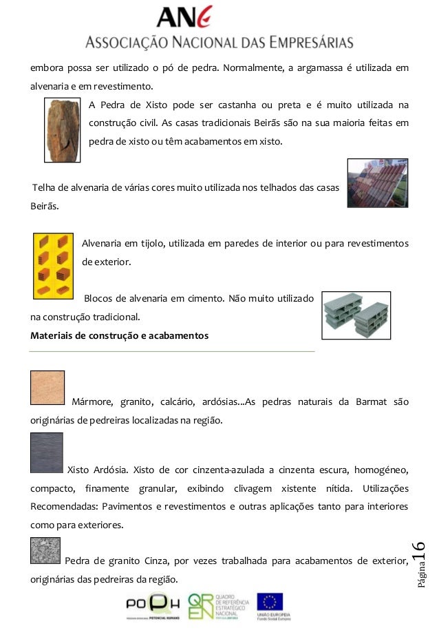 16. 16. Página16 embora possa ser utilizado o pó de pedra. Normalmente, a argamassa é utilizada em alvenaria e em revestimento. A Pedra de Xisto pode ser castanha ou preta e é muito utilizada na construção civil. As casas tradicionais Beirãs são na sua maioria feitas em pedra de xisto ou têm acabamentos em xisto. Telha de alvenaria de várias cores muito utilizada nos telhados das casas Beirãs. Alvenaria em tijolo, utilizada em paredes de interior ou para revestimentos de exterior. Blocos de alvenaria em cimento. Não muito utilizado na construção tradicional. Materiais de construção e acabamentos Mármore, granito, calcário, ardósias...As pedras naturais da Barmat são originárias de pedreiras localizadas na região. Xisto Ardósia. Xisto de cor cinzenta-azulada a cinzenta escura, homogéneo, compacto, finamente granular, exibindo clivagem xistente nítida. Utilizações Recomendadas: Pavimentos e revestimentos e outras aplicações tanto para interiores como para exteriores. Pedra de granito Cinza, por vezes trabalhada para acabamentos de exterior, originárias das pedreiras da região.