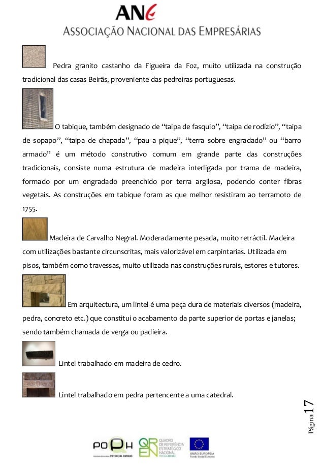 17. 17. Página17 Pedra granito castanho da Figueira da Foz, muito utilizada na construção tradicional das casas Beirãs, proveniente das pedreiras portuguesas. O tabique, também designado de “taipa de fasquio”, “taipa de rodízio”, “taipa de sopapo”, “taipa de chapada”, “pau a pique”, “terra sobre engradado” ou “barro armado” é um método construtivo comum em grande parte das construções tradicionais, consiste numa estrutura de madeira interligada por trama de madeira, formado por um engradado preenchido por terra argilosa, podendo conter fibras vegetais. As construções em tabique foram as que melhor resistiram ao terramoto de 1755. Madeira de Carvalho Negral. Moderadamente pesada, muito retráctil. Madeira com utilizações bastante circunscritas, mais valorizável em carpintarias. Utilizada em pisos, também como travessas, muito utilizada nas construções rurais, estores e tutores. Em arquitectura, um lintel é uma peça dura de materiais diversos (madeira, pedra, concreto etc.) que constitui o acabamento da parte superior de portas e janelas; sendo também chamada de verga ou padieira. Lintel trabalhado em madeira de cedro. Lintel trabalhado em pedra pertencente a uma catedral.