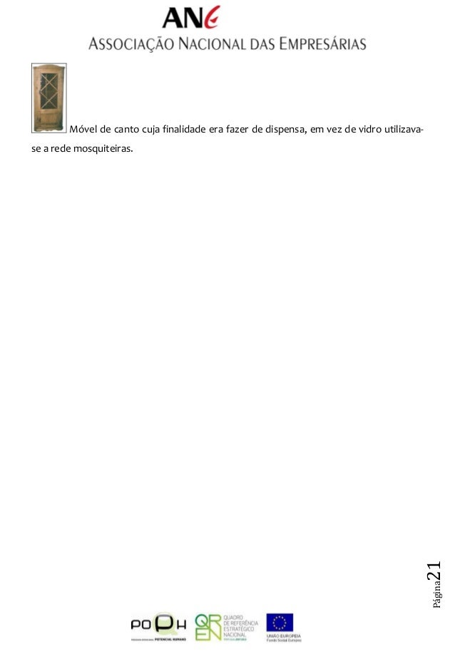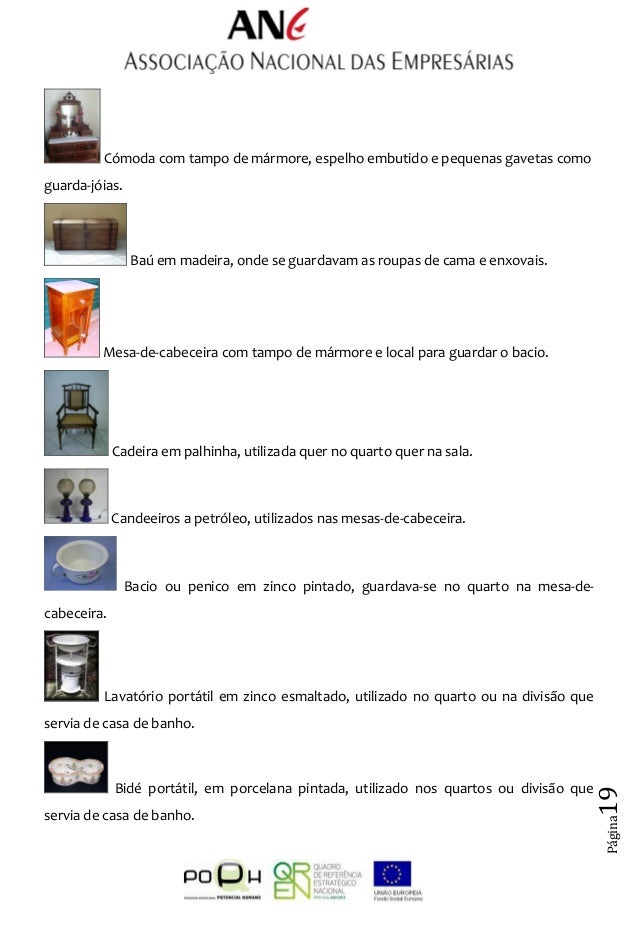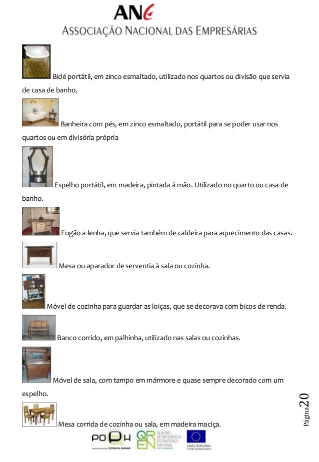 20. 20. Página20 Bidé portátil, em zinco esmaltado, utilizado nos quartos ou divisão que servia de casa de banho. Banheira com pés, em zinco esmaltado, portátil para se poder usar nos quartos ou em divisória própria Espelho portátil, em madeira, pintada à mão. Utilizado no quarto ou casa de banho. Fogão a lenha, que servia também de caldeira para aquecimento das casas. Mesa ou aparador de serventia à sala ou cozinha. Móvel de cozinha para guardar as loiças, que se decorava com bicos de renda. Banco corrido, em palhinha, utilizado nas salas ou cozinhas. Móvel de sala, com tampo em mármore e quase sempre decorado com um espelho. Mesa corrida de cozinha ou sala, em madeira maciça.